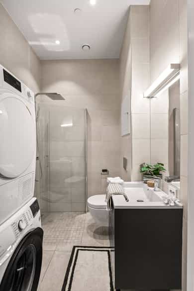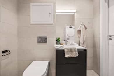 Leiligheten holder en god og moderne standard i bygg fra 2017. Entre: Parkett på gulv og malt overflate på vegger. Downlights og malt overflate i himling. Gulvvarme. Porttelefon, sikringsskap og skyvedørsgarderobe. Stue: Parkett på gulv og malt overflate på vegger. Malt overflate i himling. Gulvvarme. Utgang til balkong. Kjøkken: Parkett på gulv, og malt overflate og glass på vegg over benk på vegger. Malt overflate og downlights i himling. Gulvvarme. Innredning med mekanisk avtrekksvifte over stekesonen og opplegg for oppvaskmaskin. Det er integrert stekovn, platetopp, oppvaskmaskin og kjøl/fryseskap. Soverom: Parkett på gulv og malt overflate på vegger. Malt overflate og downlights i himling. Gulvvarme. Skyvedørsgarderobe. Bad: Flis på gulv og flis på vegger. Downlights og malt overflate i himling. Gulvvarme. Utstyrt med opplegg for vaskemaskin, dusjhjørne, innfellbare dusjdører, mekanisk avtrekk, rørfordelingsskap, vannmåler, stoppekran, veggmontert wc, servant og servantskap. Det er i forbindelse med salget utarbeidet en tilstandsrapport fra bygningssakkyndig. Tilstandsrapporten er en teknisk gjennomgang av boligen med oppdagede avvik. Forhold som har fått TG2 og TG3 må gjennomgås spesielt nøye, da disse indikerer avvik fra normal slitasje og/eller høy alder, med mulig behov for utbedring. Bygningsdeler som har fått TGIU er ikke undersøkt av takstmann. Det er ingen bygningsdeler som har fått merknad TG2 eller TG3. Bygningsdeler som ikke er undersøkt (TGIU): Elektrisk: Ingen tiltak anbefalt Varmesentral: Felles varmesentral. Varmtvannsbereder: Felles varmtvann.