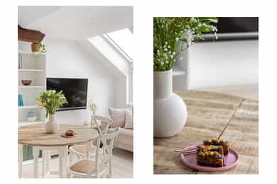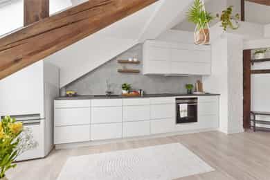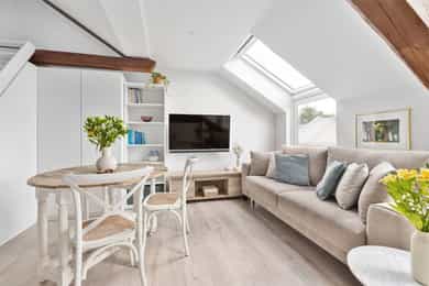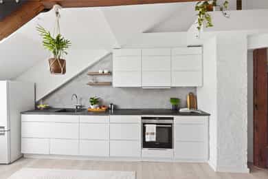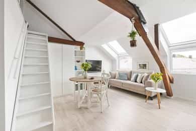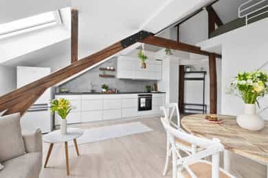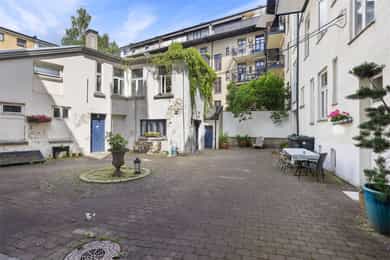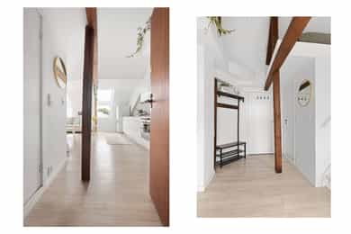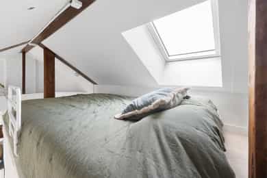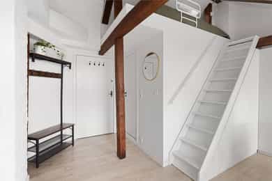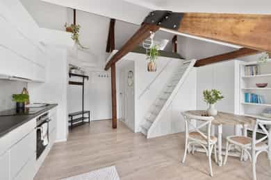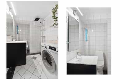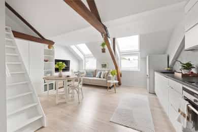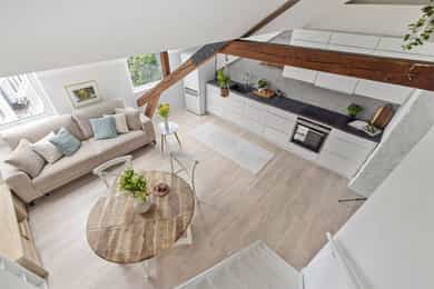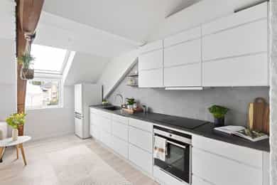 Entré: Velkommen inn! Her får du et umiddelbart godt og riktig førsteinntrykk. Ved inngangsdøren er det plass til knagger og skohylle for oppbevaring av yttertøy. Åpen kjøkken- og stueløsning: Moderne og stilsikkert kjøkken fra Kvik. Lys innredning fra 2021 med glatte fronter og benkeplate i laminat. Malt mikrosement på vegg over kjøkkenbenken. Kjøkkenet er utstyrt med integrerte hvitevarer som komfyr, platetopp, oppvaskmaskin og frittstående kjøl/ fryseskap. Det er kjøkkenventilator med avtrekk ut via kanal. Waterguard er montert under kjøkkenbenk. Det er godt med lagringsplass i både skap og skuffer, samt god plass til matlaging. Ved kjøkkenet er det god plass til spisebord. Leiligheten har en innbydende, lys og gjennomført stue med store vindusflater, god takhøyde og flotte detaljer. Det er god plass til stor sofagruppe med tilhørende sofabord og tv-benk. Leiligheten har stilrene overflater som ble pusset opp i 2021, og består av en-stavs laminat og veggene er malt i lyse, behagelige fargetoner. Stuen har en velutformet planløsning som gjør innredningsjobben enkel. De synlige bærebjelkene og teglstein gir karakteristisk særpreg. Fra stuen er det adkomst via trapp til hems. Sovehemsen har et gulvareal på ca. 4,4 kvm. Her er det plass til dobbeltseng og nattbord. Hemsen har vindu. Bad: Pent, tidløst bad med flislagte overflater og opplegg for vaskemaskin. Badet inneholder dusj, gulvstående toalett og baderomsinnredning med skuffer, servant med ett-greps blandebatteri, speil på vegg og belysning. Rommet har elektriske varmekabler, men selger opplyser at det er brudd i varmekabler og termostaten er frakoblet av elektriker. Overflater: Gulv: En-stavs laminat fra 2021 og flislagt gulv på badet. Vegger: Glatte, malte vegger (2021) og fliser på badet. Himling: Innvendige tak har malte plater. Flater er malt i 2021.