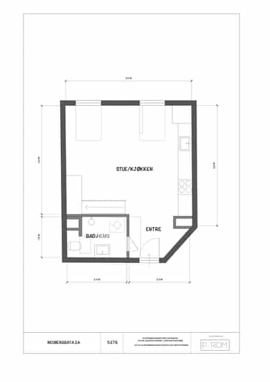 Leiligheten ligger i 5. etasje og inneholder kjøkken, stue og bad. I tillegg disponerer leiligheten en bod i kjeller cirka 5,2 kvm.