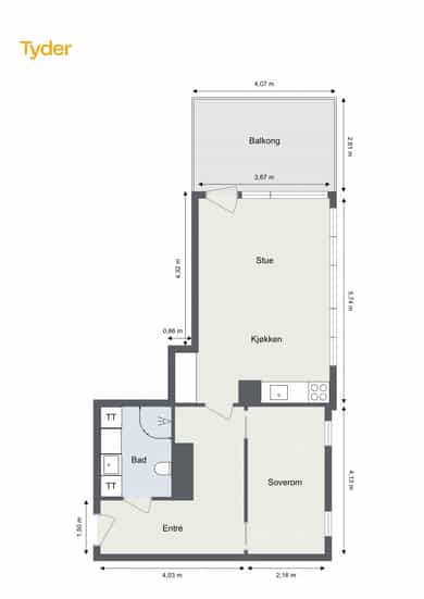 BRA-i: 49 kvm. Entré, soverom, stue/kjøkken og bad.