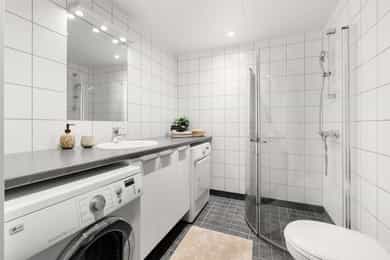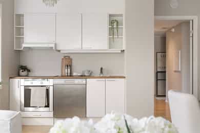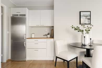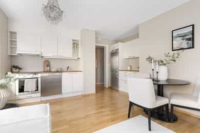 Integrerte hvitevarer på kjøkken medfølger. Vaskemaskin og tørketrommel på bad medfølger også.