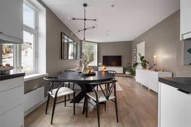 Velkommen til Arne Stangebyesgate 15A. En gjennomført og stilren leilighet med attraktiv beliggenhet på sentrumshøyden ved Apenesfjellet, i et rolig og sjarmerende område med historiske trehus og grønne omgivelser på sommerhalvåret, kun 300meter fra gågaten. Her bor du sentralt, men likevel fredelig, med kort vei til bussterminal, butikker, restauranter, elvepromenade og fine turområder. Bygården fra 1900 ble fullrenovert i 2008-2011, og fremstår velholdt, både ute og inne. Fellesområdene omfatter hage, en velpleid skjermet gårdsplass og parkering. Leiligheten i 1.etg imponerer med rene overflater, marmorerte fliser og nytt gulv fra 2025. Badet er lekkert med mikrosementerte vegger, og kjøkkenet fremstår både elegant og funksjonelt. De store klassiske vinduene gir masse lys.