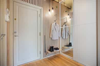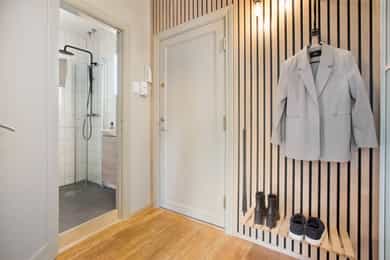 Montert spilevegg i gang, med egen skohylle og oppheng for jakker.