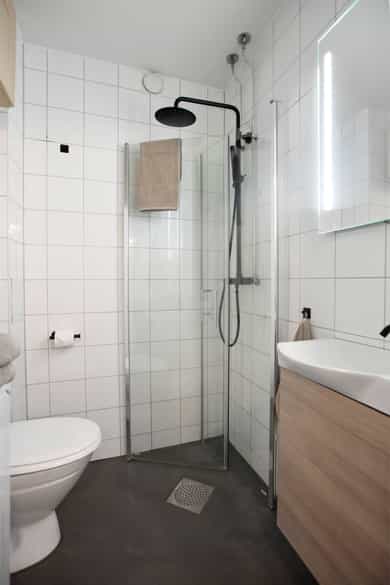 Lagt mikrosement på baderomsgulv og ny dusj.