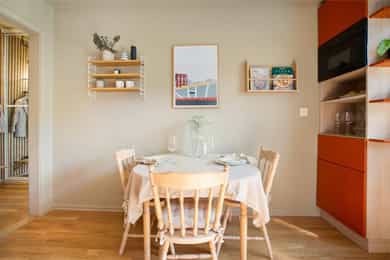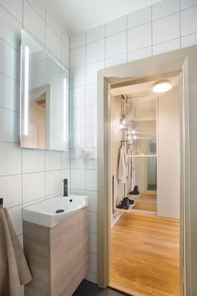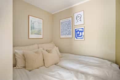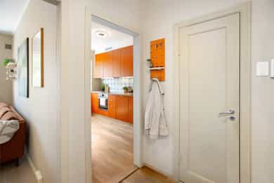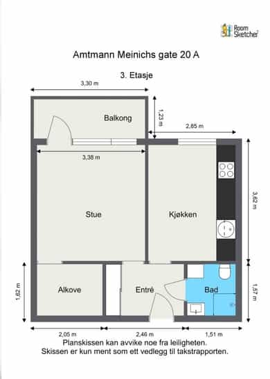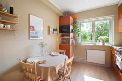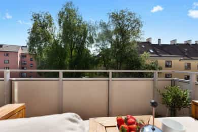 Leilighet beliggende i byggets 3. etasje. Det er adkomst via felles trappeoppgang. Oppgangen har porttelefon. Leiligheten inneholder entré, bad, stue, kjøkken og soverom. ENTRÉ: Velkommen inn! Leiligheten ønsker deg velkommen med en innbydende entré som gir et svært godt førsteinntrykk. I 2022 ble det montert en stilren spilevegg i gangen, med integrert skohylle og praktiske opphengsmuligheter for yttertøy i skyvedørsgarderobe. LYS OG LUFTIG STUE M/UTGANG TIL BALKONG: Stuen fremstår som lys og luftig, med store vindusflater som gir rikelig med naturlig lysinnslipp. Den gode planløsningen gir fleksible møbleringsmuligheter, med god plass til både sofagruppe, TV-møblement og spisebord med tilhørende stoler. Gulvet består av flott, originalt tregulv, og overflatene ble oppgradert med delikate og moderne fargetoner i 2021. Dette gir et stilrent og tidløst uttrykk, og et godt utgangspunkt for å sette sitt personlige preg på boligen. Det ble i 2022 installert smartbelysning (Philips Hue) i stue, kjøkken og gangen, som gir enkel styring og fleksibilitet i belysningen. Fra stuen er det utgang til en herlig sydøstvendt balkong på ca. 4 m² med gode solforhold. I vår- og sommerhalvåret blir balkongen en naturlig forlengelse av stuen, og et ideelt sted for hyggelige stunder med familie og venner. Her ligger alt til rette for å etablere en lun og innbydende uteplass med beplantning og grill. I 2022 ble det oppført en plassbygget sittegruppe med tilhørende bord, samt et praktisk hjørne tilpasset liten grill og urter, noe som gir en funksjonell og gjennomført uteplass. SKJERMET ALKOVE: Praktisk og skjermet sovealkove med plassbygget seng, som utnytter arealet på en effektiv måte. I 2021 ble det etablert skuffer med integrert oppbevaring under sengen, noe som gir gode og funksjonelle lagringsmuligheter. SEPARAT KJØKKEN: Stilrent kjøkken med gode oppbevaringsløsninger og rikelig med benkeplass. Kjøkkenet ble oppgradert i 2021 med nye fronter i valchromat, som gir et stilrent og særpreget uttrykk. Det ble samtidig etablert et plassbygget kjøkkenskap med integrert mikrobølgeovn, noe som bidrar til en helhetlig og funksjonell kjøkkenløsning. Kjøkkenet er videre utstyrt med integrert stekeovn, platetopp, kombiskap, mikrobølgeovn og oppvaskmaskin. BADEROM: Pent, flislagt baderom med gulvvarme, oppusset i regi av aksjelaget i 2007. Badet er innredet med servant med underskap, speil med sidelys, frittstående toalett, dusjhjørne med svingbare glassdører og opplegg for vaskemaskin. Servant med underskap og speil ble montert i 2020. I 2022 ble badet oppgradert med mikrosement på gulvet samt ny dusjløsning. Våtrommet ventileres med naturlig ventilasjon via tilluft gjennom spalte i dør og avtrekk via ventil i vegg. OPPBEVARING: Det medfølger en loft- og kjellerbod. Kjellerboden har blitt innredet med oppheng til ski og arbeidsbenk, med oppbevaring. Det gjøres særskilt oppmerksom på at bod som er medtatt som BRA-e og i totalt BRA ligger på fellesareal, men disponeres av denne leiligheten. ØVRIG INFORMASJON: Entrédør: Original (byggeår) profilert entrédør med sikkerhetslås. Vinduer: Vinduer med malte trerammer og tolags isolerglass med produksjonsår 2006 på kjøkken, samt trelags isolerglass med produksjonsår 2018 i stue. Balkongdør: Balkongdør med malte trerammer og tre-lags isolerglass med produksjonsår 2018. Overflater, etc.: Malte slette flater i alle rom. Ventilasjon: Det er naturlig ventilasjon i boligen med klaffventiler til sjakt, i yttervegger, samt tilluft via spalteventiler over vinduene. Oppvarming: Boligen er oppvarmet med gulvvarme på baderommet, ellers sentralfyr med radiatorovner.
