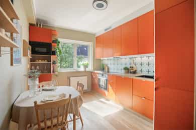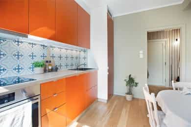 Fjernet laminat på kjøkken og slipt og oljet gulv. Også slipt opp igjen gulv i gang. Originalt tregulv i hele leiligheten.