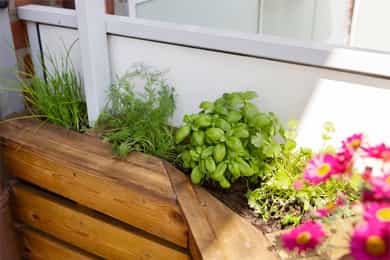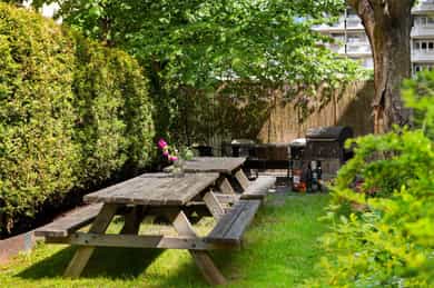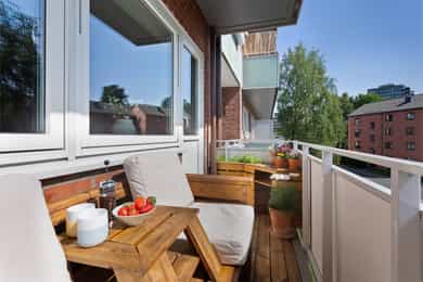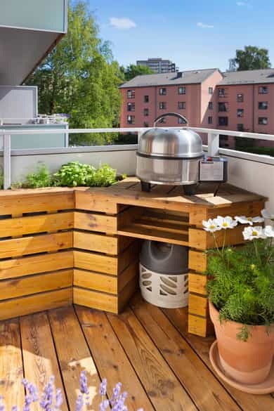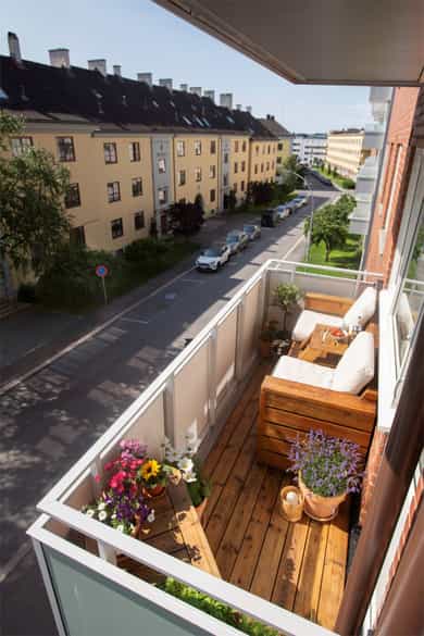 Bygd sittegruppe til balkong, med tilhørende bord og hjørne for liten grill og urter.