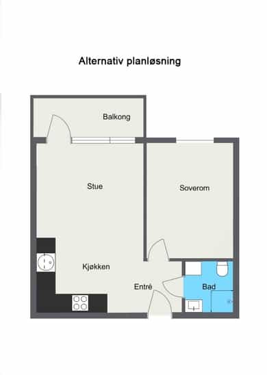 BRA-i: 34 kvm. Entré, bad, stue, kjøkken og soverom.
