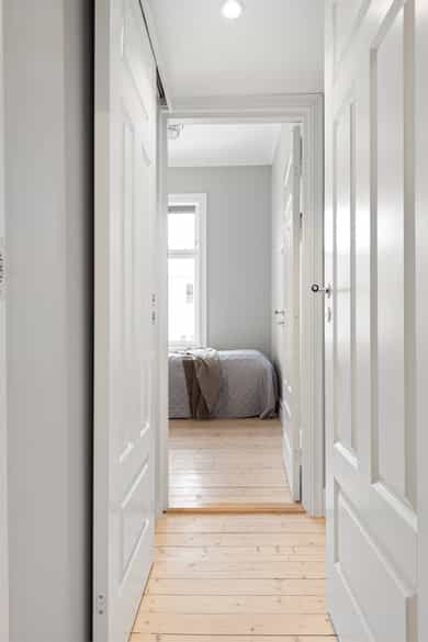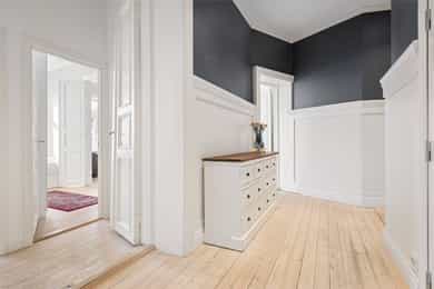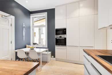 Leiligheten ble pusset opp i 2016/2017 med nyoppusset bad, kjøkken, overflater og oppgradering av det elektriske. I senere tid er den ene stuen bygd om til to soverom, noe som enkelt kan reverseres ved behov. Tak og vegger i stuen er nymalt i 2026. Venstre og midterste vindu i stuen ble skiftet i 2026. Stue: Tregulv og malt overflate på vegger. Malt overflate i himling med rosett og stukkatur . Vedovn. Garderobeskap. Kjøkken: Tregulv, og malt overflate og flis på vegg over benkeplate på vegger. Malt overflate og downlights i himling. Det er integrert kjøl/fryseskap x 2, mikroovn, stekovn, platetopp og oppvaskmaskin. Soverom 1: Tregulv og malt overflate på vegger. Malt overflate i himling med stukkatur. Garderobeskap. Soverom 2: Tregulv og malt overflate på vegger. Malt overflate i himling med rosett. Hems . Soverom 3: Tregulv og malt overflate på vegger. Malt overflate i himling med stukkatur . Garderobeskap. Soverom 4: Tregulv og malt overflate på vegger. Malt overflate i himling med stukkatur . Garderobeskap. Bad: Flis på gulv og malt overflate på vegger. Downlights og malt overflate i himling. Gulvvarme. Utstyrt med naturlig avtrekk, opplegg for vaskemaskin, servantskap, rørfordelingsskap, stoppekran, veggmontert wc og dusjnisje. Toalett: Flis på gulv og flis på vegger. Malt overflate og downlights i himling. Gulvvarme. Utstyrt med naturlig avtrekk, veggmontert wc og servantskap. Entre: Tregulv og malt overflate på vegger. Downlights og malt overflate i himling. Garderobeskap, sikringsskap og porttelefon.