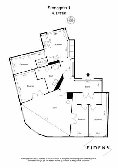 Primærrom: 4. etasje: Stue, kjøkken, 4 soverom, bad, toalett, entré.
