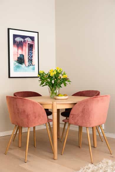 Under kan du lese om de ulike rommene: Separat kjøkken: Moderne og stilsikkert kjøkken fra Kvik 2023. Kjøkkeninnredning med glatte fronter. Laminat benkeplate med nedfelt vask. Integrert platetopp, stekeovn, oppvaskmaskin (2025) og kjøl/fryseskap. Kullfilterventilator over kokeplass. Det er god plass til det man trenger med masse lagringsplass i skuffer og skap. Fra kjøkkenet er det utgang til en herlig, liten balkong. Balkongen er nordvestvendt og vender ut mot rolig bakgård. Her er det plass til et mindre cafébord med tilhørende stoler. Romslig stue: Lys og hyggelig stue med god plass til sofagruppe med tilhørende stuebord og tv-møblement. Rommet har en planløsning som gjør det enkelt å møblere etter ønske og behov. Videre er det plass til spisebord. Hele boligen ble malt i 2022 og det ble lagt ny, flott 1-stavs parkett i 2023. Her er ingenting overlatt til tilfeldighetene! Soverom: Soverommet er lunt og vender ut mot bakgård. Her er det plass til dobbeltseng, nattbord og kommode. Det er fint med lagringsplass i garderobeløsning. Rommet er malt i en nydelig syrin-farge og preges av lekre, klassiske detaljer. Delikat baderom: Pent, flislagt baderom totalrenovert i 2022. Innredningen består av dusjhjørne med glassdør og regnfallsarmatur, servantinnredning med ovenpåliggende servant og vegghengt speil og toalett. Det er opplegg for vaskemaskin (medfølger) og behagelig gulvvarme. Overflater: Gulv: 1-stavs parkett på gulv. Flis på bad. Vegger: Malte overflater på vegger og fliser på bad. Himling: Malte plater i himling. Downlights på bad.