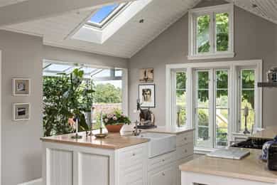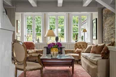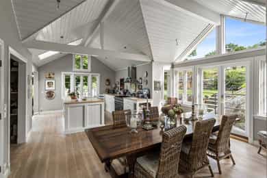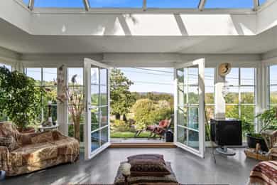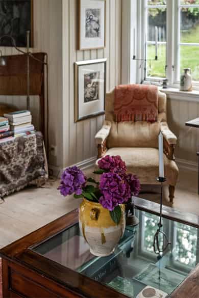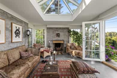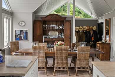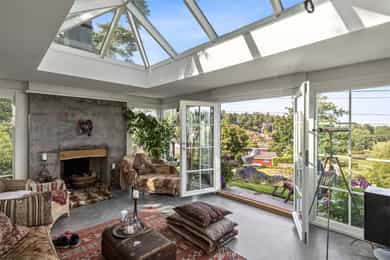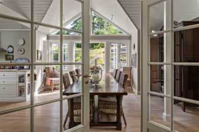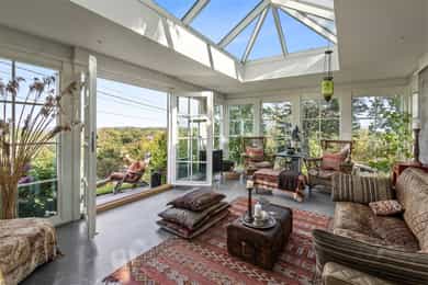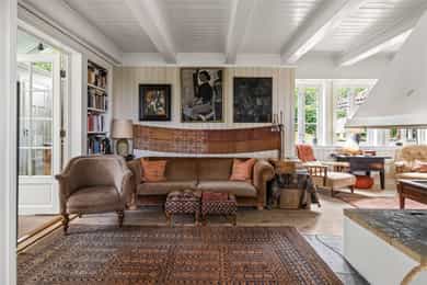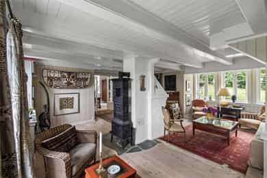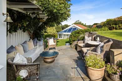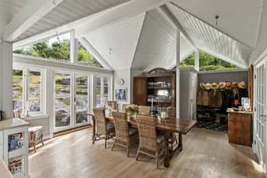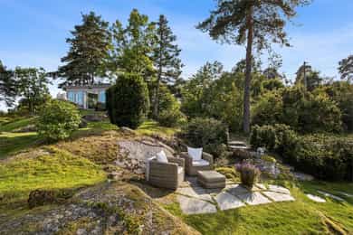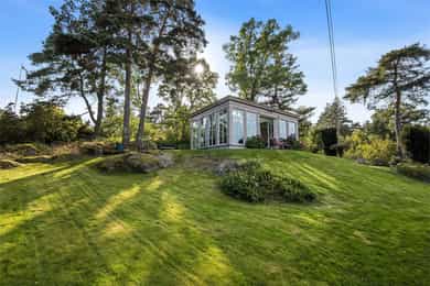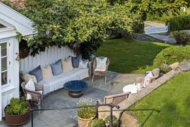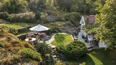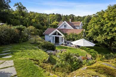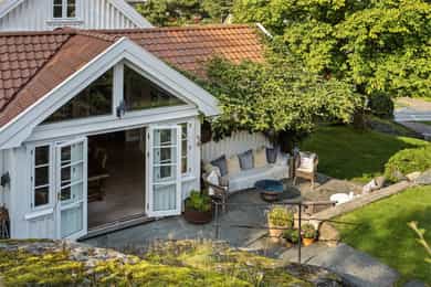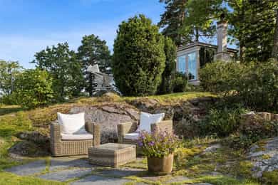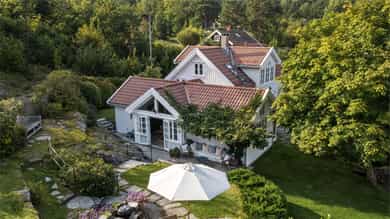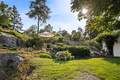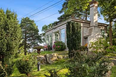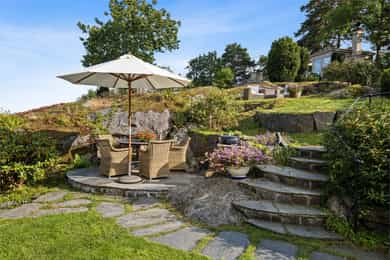 Tjøme/Hulebak - Idyllisk eiendom med sjøutsikt og stor tomt. Flotte uteplasser og garasje av høy kvalitet. Båtplass!