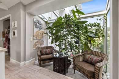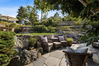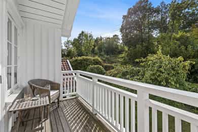 Eiendommen oppleves som en privat oase med mye boltreplass for store og små. Begge stuene har utgang til steinlagte terrasser, som innbyr til både stille stunder og lange, sosiale kvelder. Den største terrassen ligger ved spisestuen, et usjenert og delvis overbygd uterom med belysning montert. Sommerdagene tilbringes også på en koselig balkong utenfor gangen i 2. etasje.