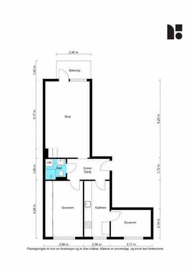BRA-i: 62 kvm. Gang, bad, kjøkken, stue og to soverom.