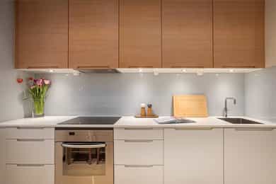 Alle hvitevarer på kjøkken medfølger – integrert kjøl/fryseskap, integrert oppvaskmaskin, samt vaskemaskin på bad medfølger.