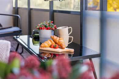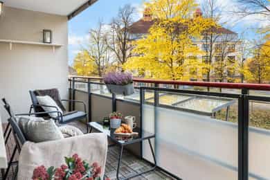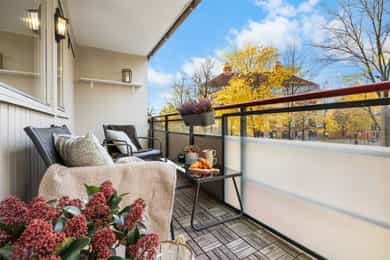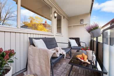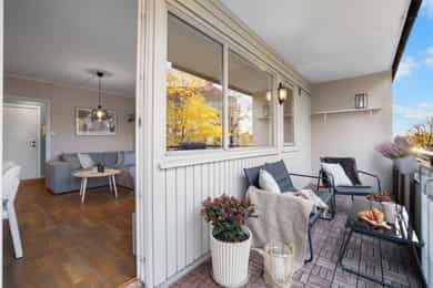 Balkongen vender mot vest, og eier opplyser om gode solforhold gjennom ettermiddagen.