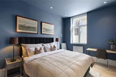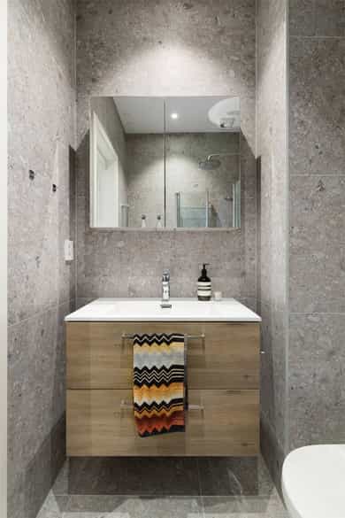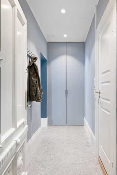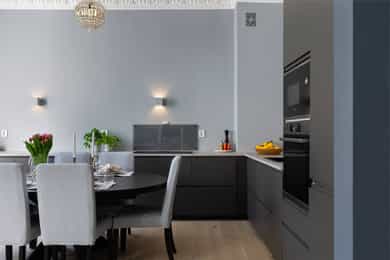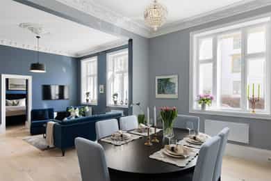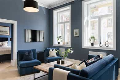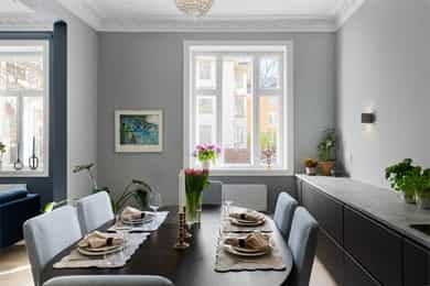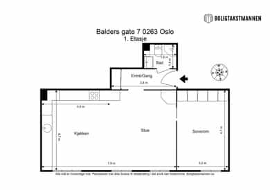 Boligen er i dag omgjort til en romslig 2-roms leilighet. Planløsningen gir imidlertid mulighet for tilbakeføring til tidligere løsning med 2-roms leilighet og hybel. Eventuelle endringer må utføres i henhold til gjeldende regelverk og etter nødvendige godkjenninger. Leilighet beliggende i byggets 1. etasje. Det er adkomst via felles trappeoppgang. Oppgangen har porttelefon. Det er installert digitale låssystemer både ved inngang til borettslaget og til leiligheten, som gir nøkkelfri og enkel tilgang. Leiligheten inneholder entré/gang, baderom, kjøkken, stue, soverom og vaskerom. ENTRÉ: Velkommen inn! Leiligheten har en innbydende entré med downlights i himlingen og gulvvarme, som gir et stilrent uttrykk og et svært godt førsteinntrykk. I 2025 ble gangen oppgradert med nye fliser og varmekabler, noe som gir både økt komfort og et moderne preg. Entréen har gode oppbevaringsmuligheter i garderobeskap, og en generøs takhøyde på ca. 2,93 m bidrar til en luftig og romslig følelse. LYS OG LUFTIG STUE: Stuen fremstår som lys og luftig, med store vindusflater som gir rikelig med naturlig lysinnslipp, samt en generøs takhøyde på ca. 3,28 m som forsterker romfølelsen. Leiligheten har klassiske detaljer som stukkatur og rosetter, som tilfører boligen et tidløst og elegant preg. Den gode planløsningen gir fleksible møbleringsmuligheter, med naturlig plass til både sofagruppe, TV-løsning og spisebord med tilhørende sitteplasser. Gulvet er belagt med lys 1-stavs parkett, og overflatene er malt i blåe fargetoner som gir et helhetlig uttrykk. Stuen har også en plassbygd peis, som tilfører både varme og en lun atmosfære. Dette gir et svært godt utgangspunkt for å skape et personlig og innbydende hjem. KJØKKEN: Stilrent kjøkken fra 2021 med god skap- og benkeplass, som gir funksjonelle og effektive arbeidsflater. Kjøkkenet har glatte, mørke fronter som gir et stilrent og moderne uttrykk, kombinert med en lys laminat benkeplate og nedfelt oppvaskkum. Ettgreps, svingbart blandebatteri med dusjfunksjon. Det er glassplate over kokesone og vaskesone. Kjøkkenet er utstyrt med integrerte hvitevarer som induksjonsplatetopp, stekeovn, oppvaskmaskin, kjøleskap og fryser. Det er installert komfyrvakt og aquastop, samt integrert ventilator med omluftsfilter i induksjonsplatetoppen. SOVEROM: Soverommet er romslig, med plass til dobbeltseng, nattbord og tilhørende møbler. Soverommet fremstår som rolig og innbydende, med vegger malt i dype blåtoner som gir en lun og harmonisk atmosfære. Rommet har også rikelig med oppbevaringsplass i et romslig garderobeskap. Takhøyde er på ca. 2,93 m. BADEROM: Delikat, flislagt baderom med gulvvarme og downlights i himlingen, renovert i 2024. Badet er innredet med servantskap med nedfelt servant, veggskap med speildører og vegghengt toalett med innebygd sisterne. Dusjsone med innfelte dusjdører i herdet glass, utstyrt med både hånddusj og regnfallsdusj. VASKEROM (FELLES TRAPPEOPPGANG): Praktisk vaskerom med flislagt gulv og malte overflater på vegger og i himlingen, renovert i 2024. Vaskerommet er plassert i trappeoppgangen og er funksjonelt innredet med laminat benkeplate, underskap med nedfelt vaskekum i stål og ettgreps blandebatteri, samt opplegg for vaskemaskin og tørketrommel. Varmtvannsbereder på 134 liter fra 2024 og rørfordelerskap er plassert på rommet. OPPBEVARING: Leiligheten disponerer to kjellerboder på henholdsvis ca. 2,9 kvm og 6,1 kvm, begge merket «H0101». Det gjøres særskilt oppmerksom på at bod som er medtatt som BRA-e og i totalt BRA ligger på fellesareal, men disponeres av denne leiligheten. ØVRIG INFORMASJON: Entrédør: Lyd og brannisolert inngangsdør med kodelås. Ytterdøren er fra 2025. Vinduer: Vinduer med koblede glass med rammer og karmer av tre. Innerdører: Innvendige dører med profilerte, malte dørblader. Innerdørene og innvendige vinduskarmer ble malt i 2021. Ventilasjon: Naturlig ventilasjon med ventil på innvendig sjakt. Elektrisk vifte på baderom, omluftsfilter på kjøkkenet. Elektrisk anlegg: Sikringsskap med automatsikringer. Oppvarming: Leiligheten oppvarmes med elektrisk oppvarming og peis, samt gulvvarme i entré og på badet.