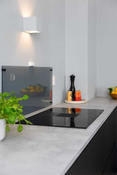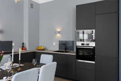 Integrerte hvitevarer medfølger, herunder platetopp, integrert kjøleskap og oppvaskmaskin.