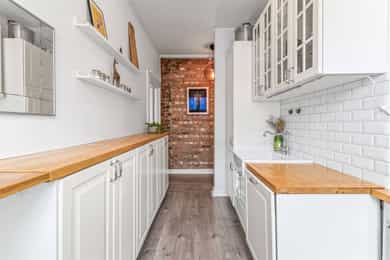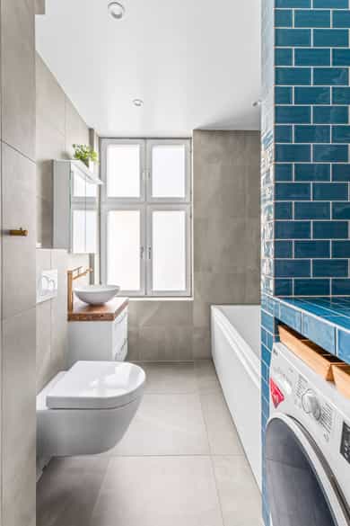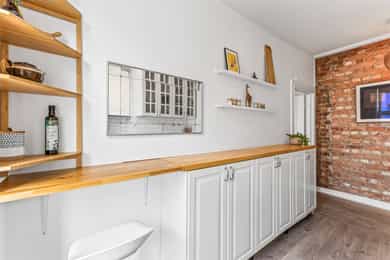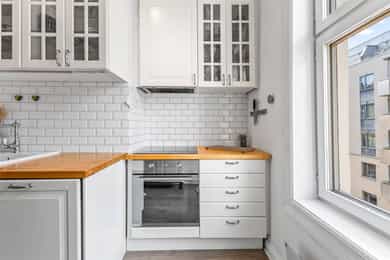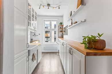 Generell tilstand: Boligen fremstår med en blanding av normalt god og noe eldre standard. Kjøkken: Kjøkkeninnredningen er ifølge eier fra 2013. IKEA kjøkkeninnredning. Kjøkkeninnredning med profilerte fronter. Overskap med glass fronter. Fliser på vegg over benkeskap. Heltre benkeplate med kum i keramikk. Stekeovn, platetopp, kjøl/frys og oppvaskmaskin er integrert i innredningen. Følgende er gitt tilstandsgrad 2: - Innredningen har fuktskader. Bad: Badet er ifølge eier pusset opp i 2017. Det er fremvist våtromsdokumentasjon. FDV dokumentasjon på produkter er fremvist. Sluk i plast. Gulv og vegger er flislagte. Det er ikke registrert hulrom/bom under flis. En banketest ble utført på tilfeldige fliser, og denne testen avslørte ingen tydelige tegn på hulrom under disse flisene. Dusj i badekar. Veggfestet klosett med innebygget sisterne. Servant. Opplegg for vaskemaskin. Benkeskap med glatte fronter. Overskap med speilfronter. Følgende er gitt tilstandsgrad 2: - Det er ikke tilstrekkelig fall mot sluket. Forholdet kan medføre begrenset drenering av bruksvann på gulvet. Det er tilstrekkelig høydeforskjell mellom membran i døråpning og slukrist. - Det er registrert vindu i deler av våtsonen. Vinduet er av organisk materiale og har derfor høyere risiko for fuktskader. - Svelling og avflassing i innredningen. Hulltaking: Fuktmåler av typen Protimeter MMS 2, utstyrt med piggelektrode, ble brukt på treverket, og det ble ikke registrert fuktighetsnivåer over det som er normalt. Ytterdør: Entrédør i brannklasse B30 datert 1986. Følgende er gitt tilstandsgrad 2: - TG2 er gitt grunnet alder sett i lys av forventet levetid og normal slitasje. Vinduer: Vinduer med tolags isolerglass og enkeltglass, produsert i 1986. Følgende er gitt tilstandsgrad 2: - TG2 er gitt grunnet alder sett i lys av forventet levetid og normal slitasje. Eldre vinduer har generelt normalt økt varmetap og i noen tilfeller nedsatt funksjonsevne. Innvendige dører: Profilerte innvendige dører i tre. Enkelte dører er av eldre dato. Dørene har normal slitasje i forhold til alder, som inkluderer noen bruksmerker. TG1 er gitt etter en helhetsvurdering. Etasjeskiller: Etasjeskiller i trekonstruksjon. Det er foretatt stikkprøver for måling av gulvoverflater i følgende rom: Stue, kjøkken, to soverom og entré. Følgende er gitt tilstandsgrad 3: - Forskjellen på høyeste og laveste punkt er målt til ca. 65 mm i stue og ett soverom og 52 mm i kjøkken. Tg 3 er gitt iht. toleransekrav i NS3600. Konsekvensen er at gulvet kan oppleves skjevt. Estimatet er satt til 50 000 - 100 000 kr. Kostnadsestimatet er basert på avtretting av gulvet/etasjeskiller. For å få tilstandsgrad 1 må høydeforskjeller rettes opp. Det vil imidlertid sjelden være økonomisk rasjonelt som et enkeltstående tiltak i en bolig som dette. Dersom boligen en gang skal renoveres, kan man vurdere slike tiltak Overflater: Gulv: Flislagte overflater i entré. Laminat. Det er registrert noe knirk ved normal gange. Gulvene har normal slitasje i forhold til alder, som inkluderer noen bruksmerker. Normal slitasje i forhold til alder og bagatellmessige forhold er ikke hensyntatt i tilstandsvurderingen, da dette er en subjektiv vurdering. Vegger: Teglstein. Tapet. Sparklet/pussede og malte overflater. Himling: Sparklet og malte plater i badet. Originale himlinger med stukkatur og rosett i stue. Pusset og malte overflater for øvrig. Himlingshøyde i stue er målt til ca. 2,83 meter. Følgende er gitt tilstandsgrad 2: - Det er funnet bom under flere fliser i entré. Årsak til bom kan være at det ikke er oppnådd full limdekning, og/eller bruksbelastning. Større områder med bom i fliser kan medføre at sprekkdannelser i fliser eller fuger kan oppstå. I dette tilfellet er det registrert bom i et større felt. Tilfellet har medført sprekkdannelser i flis/fug i nevnte område. - Det er observert noe sprekkdannelser i stue og ett soverom. TG2 er gitt på grunn av nevnte forhold. Normal slitasje i forhold til alder og bagatellmessige forhold er ikke hensyntatt i tilstandsvurderingen, da dette er en subjektiv vurdering. Pipe: Pusset og malt teglsteinspipe. Kun pipens overflater i boligen er besiktiget/vurdert. Pipen ligger under boligsammenslutningens ansvarsområde. Ildsted: Eldre vedkamin med flislagt felt foran peis. Følgende er gitt tilstandsgrad 2: TG2 er gitt på grunn av alder og normal slitasje. Ildstedet er ikke funksjonstestet under befaringen. Ledningsnett for sanitær: Ledningsnett for vanntilførsel med rør-i-rør. Fordelerskapet er lokalisert i badet. Synlig drensrør fra fordelerskapet ut i badet. Stoppekraner for badet er lokalisert i fordelerskap og inspeksjonsluke. Vanntrykk og funksjon på avløp er testet og funnet ok. Hovedstoppekraner er testet og funnet tilfredsstillende. Ledningsnett for vanntilførsel i eldre kobberør i kjøkkenet. Avløpsrør i støpejern, skjult i konstruksjonen. Stoppekraner for kjøkkenet er lokalisert i kjøkkenbenk. Vanntrykk og funksjon på avløp er testet og funnet ok. Hovedstoppekraner er testet og funnet tilfredsstillende. Følgende er gitt tilstandsgrad 2: - Tg 2 er gitt på grunn av alder sett i lys av forventet levetid. Eldre ledningsnett vil på generelt grunnlag ha noe høyere risiko for lekkasjer. Tilstanden er vurdert ut fra alder og enkle visuelle observasjoner, da undertegnede ikke har spesialisert kompetanse på området. Kun boligens innvendige røranlegg er vurdert, mens store deler av ledningsnettet er skjult i konstruksjonen og kunne ikke inspiseres ved befaringen. Ved behov for en mer detaljert kontroll, må fagkyndig med spisskompetanse engasjeres. Ventilasjon: Oppdriftsventilasjon med ventil i bad og kjøkken. Elektrisk avtrekksvifte og ventilator er tilkoblet felles kanal. Luftespalte under dør mot våtrom. Oppdriftsventilasjon med begrenset avtrekk fra byggeår. Denne boligen er utstyrt med et oppdriftsventilasjonssystem, som påvirkes av både eksterne og interne k