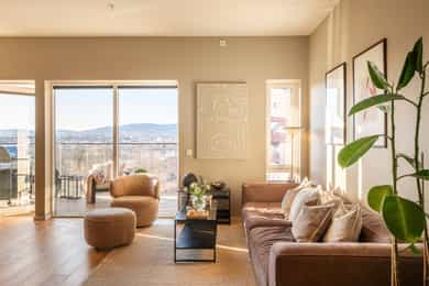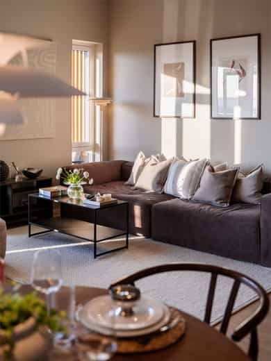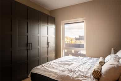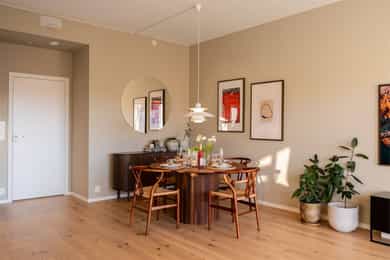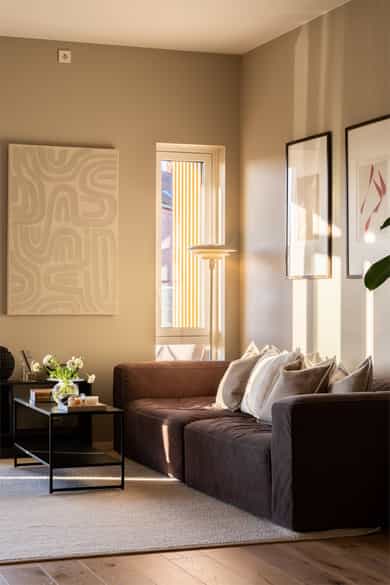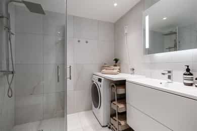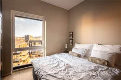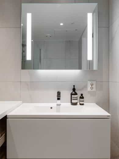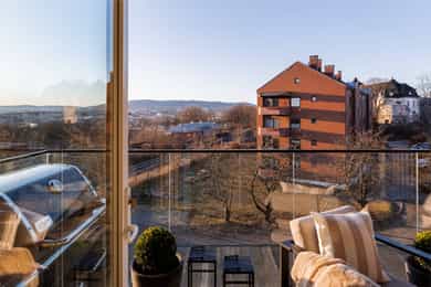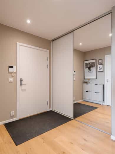 Innvendig fremstår boligen som svært solid og lekker, med en arealeffektiv planløsning og gode romløsninger. Boligen er påkostet utover ny standard med blant annet Quick-Step 1-stavs eikeparkett, plisségardiner i hele leiligheten og skyvedørsgarderobe med speil i gang. Kjøkkenet er oppgradert med Tapwell-kran, underlimt vask og integrert mikro i skap, og det lekre badet er oppgradert med 60x60 fliser, blandebatteri til servant og regndusj. Leiligheten har behagelig vannbåren gulvvarme i entré, stue/kjøkken og på badet. Oppholdsrommene preges av tidsriktige uttrykk, smakfulle materialvalg og lyse fargekombinasjoner som gir boligen et moderne og nøytralt preg. Planløsningen er sosial og velfungerende, hvor stue, spisestue og kjøkken ligger i åpen løsning. Dette gir gode soner, luftig romfølelse og mange innredningsmuligheter. Store vindusflater i de fleste rom slipper inn rikelig med lys og bidrar til en god atmosfære. ENTRÉ Boligen ligger fint til i byggets 5. etasje, med heisadkomst til leilighetsplan. Allerede ved inngangsdøren ønskes du velkommen av en innbydende og romslig entré som gir et svært godt førsteinntrykk. Det er rikelig med plass til oppheng av yttertøy i en plassbygd skyvedørsgarderobe med speilfronter, som bidrar til en praktisk og ryddig hverdag. STUE Den lyse og hyggelige stuen byr på gode innredningsmuligheter. Store vindusflater kombinert med en takhøyde på 2,9 meter skaper en svært behagelig romfølelse og sørger for rikelig lysinnslipp. Rommet oppleves lyst og luftig, og kan enkelt møbleres med sofa, TV-møblement, spisebord og øvrig inventar. Fra stuen er det direkte utgang til en herlig balkong på ca. 13 m², hvor man kan nyte solen og få en god overgang mellom ute- og innerom. Balkongen har plass til flere sittegrupper og grill, og vender ut mot hyggelige omgivelser. Selger opplyser om ettermiddagssol fra ca. kl. 15 til 20–21 på sommerstid. KJØKKEN Lekkert kjøkken i åpen og sosial løsning mot stuen, ideelt for både hverdagsbruk og hyggelige sammenkomster. Kjøkkenet er utformet med fokus på funksjonalitet og stil, og har rikelig med skap- og benkeplass. Innredningen har moderne, glatte fronter og kompositt benkeplate. Kjøkkenet er godt utstyrt med integrerte hvitevarer som stekeovn, platetopp, mikro, oppvaskmaskin og kjøl/frys. Det er mekanisk avtrekk tilknyttet leilighetens balanserte ventilasjonsanlegg. BAD Lekkert bad med moderne og stilrene farge- og materialvalg. Innredningen består av servantskap med heldekkende servant, vegghengt toalett, dusjhjørne med innfellbare dører og opplegg for vaskemaskin. Badet har behagelig vannbåren gulvvarme og downlights i taket. Det er mekanisk avtrekk tilknyttet leilighetens balanserte ventilasjonsanlegg. SOVEROM 1 Romslig hovedsoverom med god plass til dobbeltseng og tilhørende møblement. Et stort garderobeskap gir rikelig med oppbevaringsplass. Store vindusflater i kombinasjon med god takhøyde gir et flott lysinnslipp og en luftig atmosfære. Soverommet er også utstyrt med elektrisk utvendig solskjerming som bidrar til et behagelig inneklima og effektiv skjerming mot sollys. Veggene har en lun og beroligende fargetone som skaper en avslappende atmosfære. SOVEROM 2 Lyst og fleksibelt soverom med mange bruksmuligheter, enten som barnerom, gjesterom eller hjemmekontor. Rommet har plass til både seng og garderobe, og den nøytrale stilen gjør det enkelt å tilpasse etter behov. Elektrisk utvendig solskjerming gir et komfortabelt inneklima og effektiv solskjerming. Innvendig overflater: - Gulv: Parkett. Fliser på baderom. - Vegger: Malte plater. Fliser. - Himlinger: Malte plater. Malt betong. Takhøyde på ca. 2,94m i stue og kjøkken.
