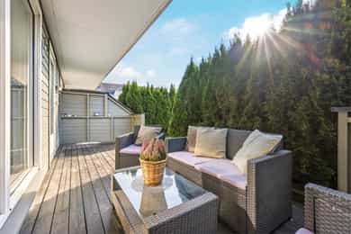 Utemøbler og parasoll på uteplassen medfølger i handelen.