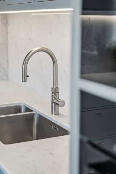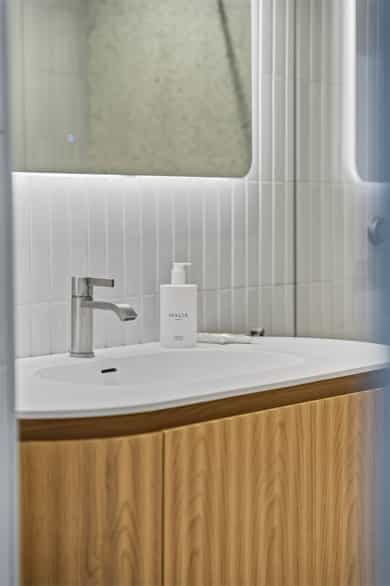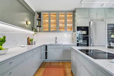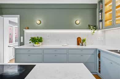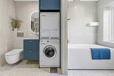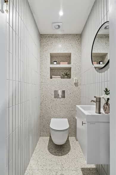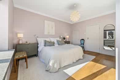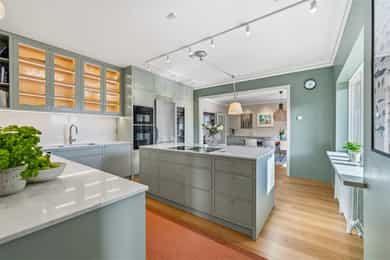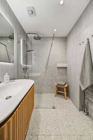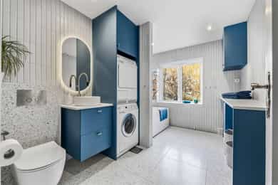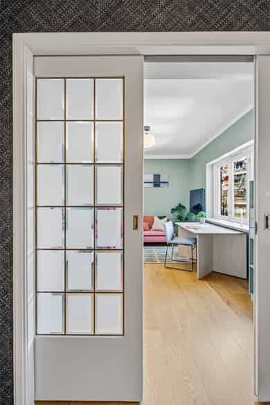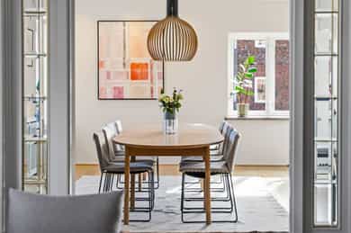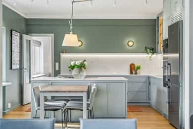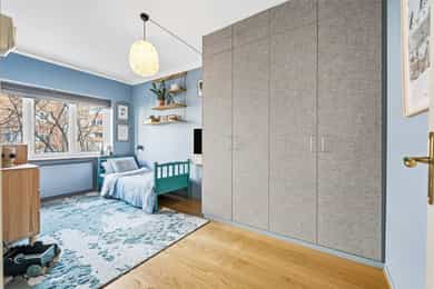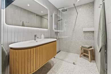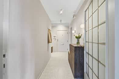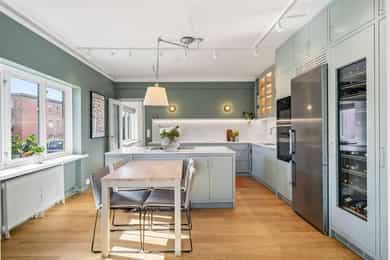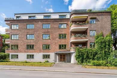 INNVENDIG Gulv består av 1-stavs eikeparkett. Våtrom har flislagte gulv, og det er lagt nye fliser med varmekabler i gangen. Veggene har i hovedsak slette, malte flater, samt enkelte vegger med tapet og fliser i våtrom. Takene er slette og malte, med spotter, skinnesystem og vegglamper som lyskilder. Boligen har store vindusflater som gir godt lysinnslipp. Etasjeskiller er utført i trebjelkelag. Leiligheten har åpen peis i peisestue, tilkoblet aksjelagets felles teglsteinspipe. Fellesområdene har malte oppganger med trapper i betong og rekkverk med spiler i jern. I baktrapp er det tilsvarende betongtrapp med rekkverk i jern. Innvendig har leiligheten malte, slette dører samt dører med glass/fasetslipt glass. Det er 2-fløyet dør til stue med fasetslipt glass. VÅTROM Våtrom har flislagte gulv, og det er lagt nye fliser med varmekabler i gangen. Veggene har i hovedsak slette malte flater, samt enkelte vegger med tapet og fliser i våtrom. Badene er rehabilitert av Bad & Byggservice AS. Vurderingen er lagt til grunn etter byggteknisk forskrift fra 2017. Det foreligger dokumentasjon i form av kvitteringer og FDV-dokumentasjon for arbeidene. Veggene er flislagt med stående fliser i format ca. 5 x 25 cm, og himlingen er malt. Det er dimbare, innfelte spotter samt belysning i speil som lyskilder. Det er gjennomført stikkprøvekontroll av flisene for å avdekke eventuell bom bak fliser. Gulvet er flislagt med fliser i format ca. 60 x 60 cm og er utstyrt med varmekabler. KJØKKEN Kjøkkenet har høy standard og er fra 2024, levert av Brodahl & Jahren Design. Innredningen har glatte fronter og består av en åpen kjøkkenløsning med kjøkkenøy og sitteplasser. Gulvet er belagt med en-stavs parkett, veggene har slette, malte flater, og himlingen er slett malt. Belysningen består av spotteskinner, design vegglamper og taklampe, samt integrert belysning i skap og hyller. Benkeplaten er i “Mystery White” polert kompositt , ca. 20 mm tykkelse, med underlimt vask i stål fra Blanco og ettgreps kjøkkenarmatur med Quooker-funksjon. Mellom benkeplate og overskap, samt på bakvegg, er det montert kompositt plate i tilsvarende utførelse som benkeplate. Kjøkkenet har planlimt induksjonstopp med integrert avtrekk med kullfilter fra Miele. Det henvises til tilstandsrapporten for nærmere opplysninger om hvitevarer. SPESIALROM Leiligheten har eget toalettrom. Gulv og vegger er flislagt. Rommet er utstyrt med vegghengt toalett og servantinnredning med skap, toppmontert servant og ettgreps blandebatteri. TEKNISKE INNSTALASJONER Tilførsel til leiligheten er utført med kobberrør. Fra fordelerskap er det rør-i-rør-system frem til rom med vanntilførsel i leiligheten. Det er synlige avløpsrør i plast under vasker på bad og kjøkken. Avløpsrørene er tilkoblet soilrør (hovedavløpsrør) i støpejern. Boligen har naturlig ventilasjon. Leiligheten har varmtvann fra et felles varmtvannsanlegg. Leiligheten har vannbåren varme til radiatorer. Sikringsskapet er utstyrt med automatsikringer. Hovedsikringene er på 63 ampere. BALKONGER OG BODER Fra spisestuen er det utgang til balkong via balkongdør. Balkongen er sydvendt med rekkverk i mur og integrert blomsterkasse. Dekket er utført i malt betong. Leiligheten disponerer to boder; én i felles loftsetasje og én i felles kjeller. I tillegg er det tilgang til fellesrom for aksjelagets medlemmer, herunder vedbod, skibod og vaskerom. Det er i forbindelse med salget utarbeidet en tilstandsrapport fra bygningssakkyndig. Tilstandsrapporten er en teknisk gjennomgang av boligen med oppdagede avvik. Bygningsdeler som har fått TG2: * Kjøkken/ avtrekk Tilstandsrapport for boligen er vedlagt salgsoppgaven. Se denne for nærmere informasjon om tilstandsgrad.