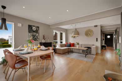 Velkommen til Skranevegen 91! Boligen har en sentral og attraktiv beliggenhet på Søreide med nærhet til det meste man skulle trenge i hverdagen. Selv om man har en sentral beliggenhet ligger leiligheten tilbaketrukket fra støy og i rolige og fine omgivelser. Området er meget barnevennlig i trygge omgivelser med godt naboskap. Det er gangavstand til skoler, barnehage og dagligvarebutikker. Meny Dolviken og Rema 1000 Søreide ligger bare noen to minutters gange fra boligen. I tillegg ligger Fanatorget bare 12 minutters gange eller tre minutters kjøring fra leiligheten. Her finner man dagligvarebutikk, apotek og noen butikker. Ellers er det kort vei til Lagunen Storsenter. Senteret kan tilby det meste man skulle trenge i hverdagen. Lagunen er nylig blitt bygget ut og har over 210 virksomheter, blant annet butikker, serveringssteder, kino og øvrige service- og tjenestetilbud. Det er flotte turmuligheter i området, her har man blant annet Storrinden med flott utsikt eller Skranevannet rundt en et flott sted for å ta en rusletur eller joggetur. Det er også flere idrettsanlegg/fritidstilbud som blant annet Sandslihallen. Fra boligen har man nærhet til skoler og barnehager. Eldshovden barnehage ligger bare 400 meter fra leiligheten og Aurdalslia skole ligger en kort gåtur unna. Det er også kort vei til Skranevatnet skole og Sandsli videregående skole. Det er gode kollektivtilbud i området. Dolvik terminal ligger bare to minutters gange fra leiligheten og her går det flere ulike ruter blant annet ekspressbuss til sentrum og til Lagunen. Ca. 15 minutters gange kommer man til bybanestopp. Fra leiligheten er det kort kjøretur til mange arbeidsplasser på Sandsli, Kokstad og Flesland. En kort prat med selger: - Hva kommer du til å savne med boligen og området? Boligen er lys og luftig, god planløsning, hjemmekoselig, stille og rolig sameie, fine turmuligheter til Storrinden. Kort vei til matbutikker, Rema 1000 og Meny, kort vei til offentlig kommunikasjon. - Beskriv naboene dine og nabolaget ditt. Tur til Storrinden, ellers turer i nærområdet. - Fortell litt om nærmiljøet generelt. Nabolaget er blitt en blanding av av yngre barnefamilier til eldre uten barn. Trygt og godt sameie, lov med husdyr og det er både hunder og katter i sameiet. - Hva er dine favoritt-turer i nærområdet? Offentlig kommunikasjon i nærheten, sammen med to matbutikker, det er flere barnehager i området, skole ved Fanatorget og Skranevannet. Ellers er det flere treningssenter i nærheten man kan velge å benytte.