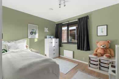1. ETASJE Entré: Velkommen! Boligen har inngang fra carporten. I entréen er det plass til å henge fra seg yttertøy og sette fra seg sko. Det er praktiske fliser på gulvet, samt malte slette veggflater. Det er elektrisk gulvvarme i entréen/gangen. Tre soverom: Boligen har tre soverom. Hovedsoverommet har plass til dobbeltseng med tilhørende nattbord. Videre er det plass til klesoppbevaring i skyvedørsgarderobe. Soverom nr. 2 og 3 fungerer ypperlig som barnerom, gjesterom eller kontor - her er mulighetene mange. Rommene har plass til seng, nattbord, garderobeløsning og evt. skrivebord. Bad og vaskerom Etasjen har et romslig baderom, med tilkomst til eget vaskerom. Rommet har flislagt gulv med elektrisk gulvvarme. Badet har flislagte vegger og malt slett himling, og vaskerommet har malte slette veggflater. Innredningen på badet består av servantskap med nedfelt servant, underskap og 1-greps blandebatteri. I tillegg er det satt inn dusjhjørne med glassdører og vegghengt toalett. Vaskerommet har opplegg for vaskemaskin og tørketrommel, samt varmtvannsbereder. Det er etablert en benk over vaskemaskin og trommel, samt hengt opp hyller på veggene. Bod: Fra gangen er det inngang til en praktisk innvendig bod. Her er det rikelig med lagringsplass. I tillegg er det tilgang til en utebod ved carporten. 2. ETASJE Stue: Fra trappen kommer man opp til et lyst og stort oppholdsrom. I den ene enden ligger kjøkkenet, og i den andre enden finner man stuen. I stuen er det god plass til stor sofaseksjon og tv-møbel. Det er tilkoblet en vedovn i stuen, samt varmepumpe ved kjøkkenet - disse sikrer behagelig innetemperatur hele året! Det er verdt å få med seg at selger har montert screens/solskjerming utvendig i stua, samt plisségardiner innvendig i nesten alle vinduer. Fra stuen er det utgang til en sydøstvendt takterrasse på hele 47 m². Her ute er det god plass til flere sittegrupper, samt grill. Det er montert en fin pergola med tak på terrassen. Kjøkken: Kjøkkenet er svært godt utnyttet, og byr på rikelig med benk- og skapplass. Det er god plass til stort spisebord ved kjøkkenet, her er det enkelt å underholde gjestene mens middagen forberedes! Kjøkkeninnredningen har skap med slette fronter, samt nedfelt oppvaskkum med 1-greps blandebatteri i benkeplaten. Videre er det plass til frittstående kjøle-/fryseskap, samt integrert oppvaskmaskin, ovn og platetopp. Toalettrom: Det er inngang til et praktisk toalettrom. Her er det vegghengt toalett, samt servant med underskap og speil. Innvendige overflater: Gulv: Fliser i entré, bad og vaskerom. Laminat i øvrige rom. Vegger: Fliser på bad. Malte slette flater i øvrige rom. Tak: Malte slette flater. For full oversikt over tilstandsgrader, se punktet Byggemåte eller se vedlagt eierskifterapport.