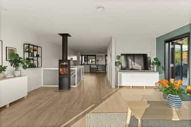 Elektrisk gulvvarme i flislagte gulv. Peisovn og luft til luft varmepumpe i stue/kjøkken.