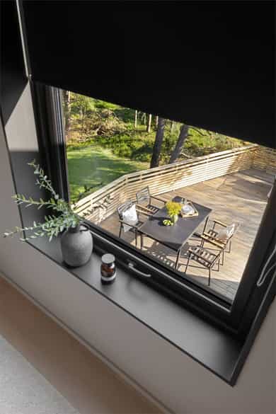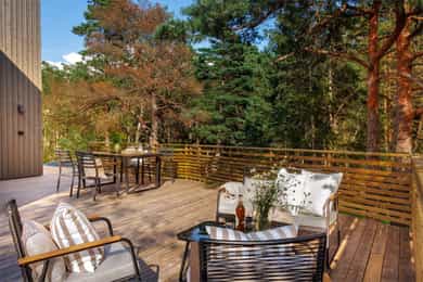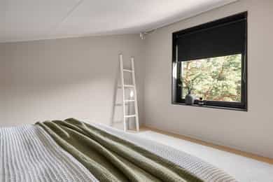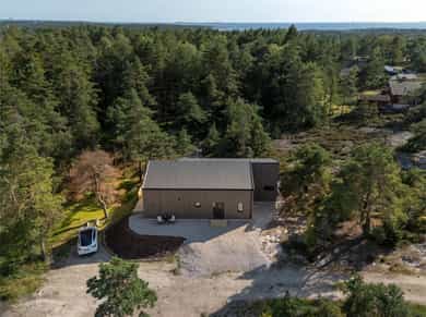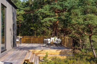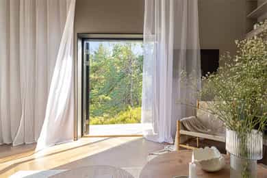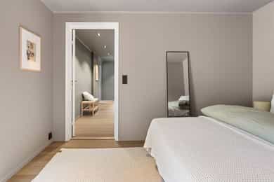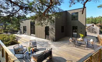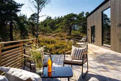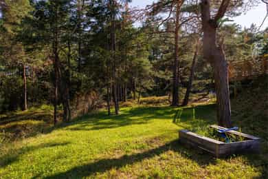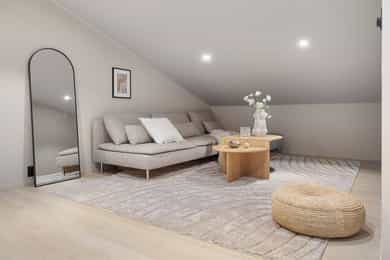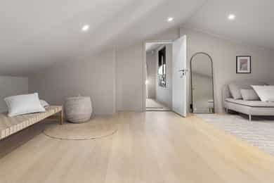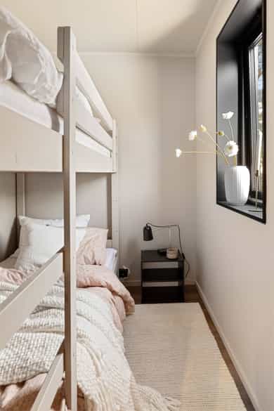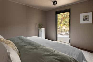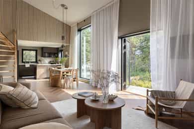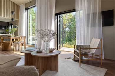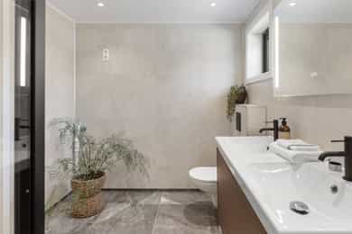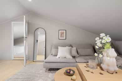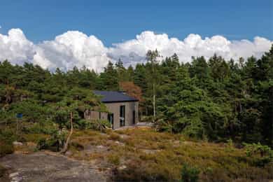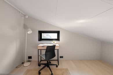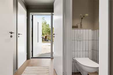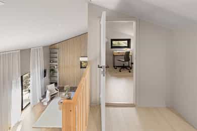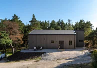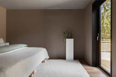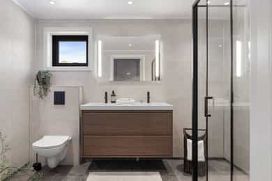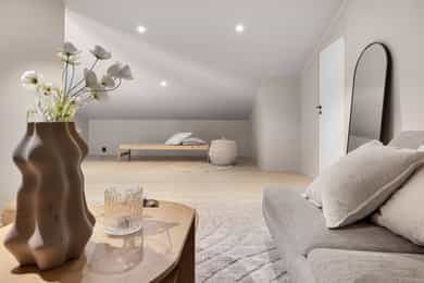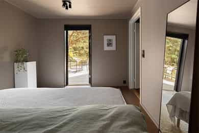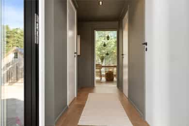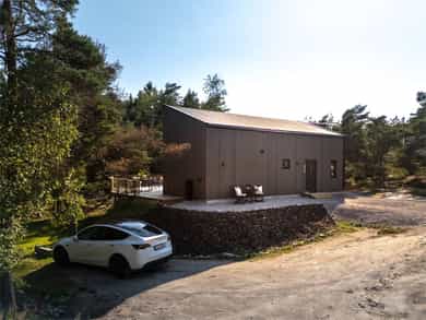 Vi kjører mot kysten og svinger opp på en ås, 16 min unna Fredrikstad sentrum. Der møter vi Skjellumåsen 44 i et felt av spredte ferieboliger som grenser mot store skogområder mot nord og øst. Dette er et flott sted for en helårs hytte, og det finnes masse populære badeplasser i fin sykkelavstand - Buvikstranda, Mærrapanna og Hankø. Du kan velge og vrake mellom marinaer der du kan leie båtplass. Boligen fra 2024 er arkitekttegnet og stilfull. Trekledningen og formen er både minimalistisk og diskret. Terrassen hviler fint ut mot skogen på sørsiden og gir et fredfylt sted å innta måltider og ta inn naturen. Innvendig møter du et arkitektonisk spennende hus med god plassutnyttelse og en gjennomført, elegant stil. Halve boligen har åpen himling, med fenomenal takhøyde og store vinduer.