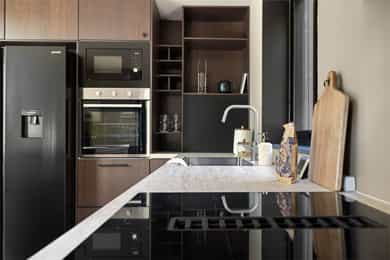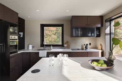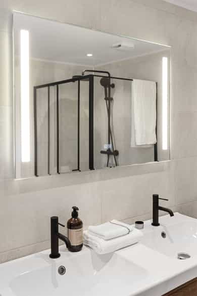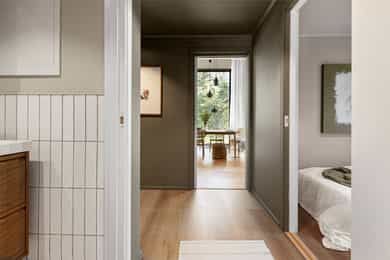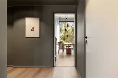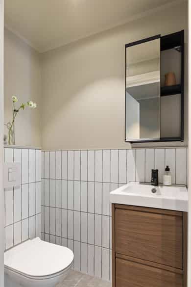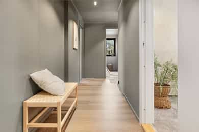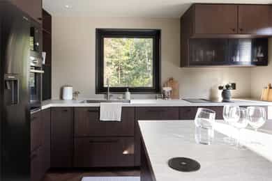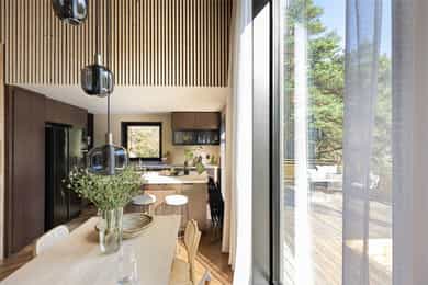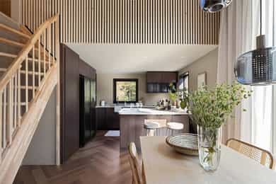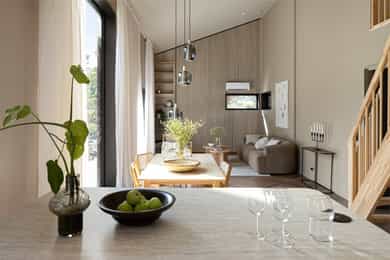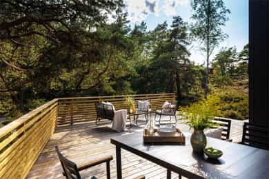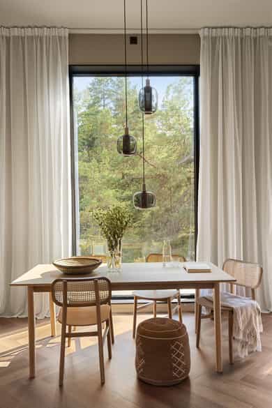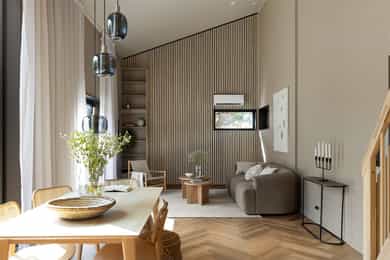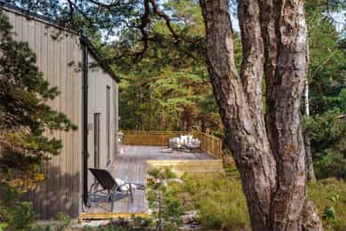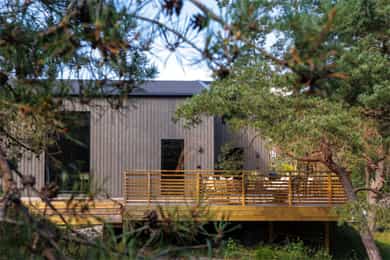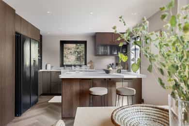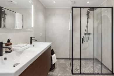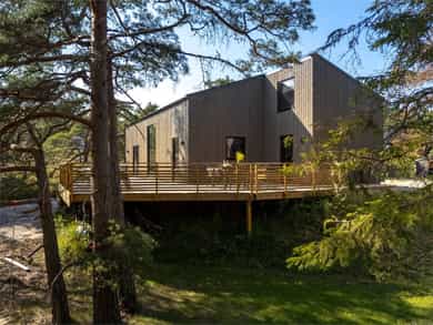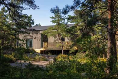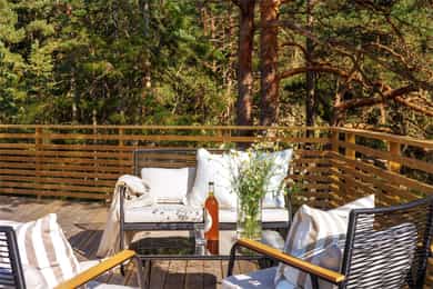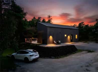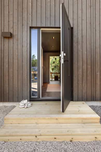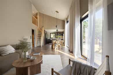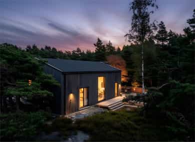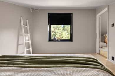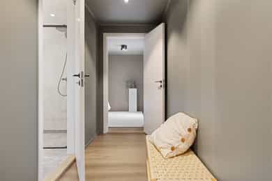 Vi kjører mot kysten og svinger opp på en ås, 16 min unna Fredrikstad sentrum. Der møter vi Skjellumåsen 44 i et felt av spredte ferieboliger som grenser mot store skogområder mot nord og øst. Dette er et flott sted for en helårs hytte, og det finnes masse populære badeplasser i fin sykkelavstand - Buvikstranda, Mærrapanna og Hankø. Du kan velge og vrake mellom marinaer der du kan leie båtplass. Boligen fra 2024 er arkitekttegnet og stilfull. Trekledningen og formen er både minimalistisk og diskret. Terrassen hviler fint ut mot skogen på sørsiden og gir et fredfylt sted å innta måltider og ta inn naturen. Innvendig møter du et arkitektonisk spennende hus med god plassutnyttelse og en gjennomført, elegant stil. Halve boligen har åpen himling, med fenomenal takhøyde og store vinduer.