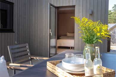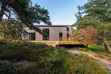 Nyoppført feriebolig på lun tomt. Stor takhøyde, luftig eleganse og god standard. Nær fine badeplasser og turområder.