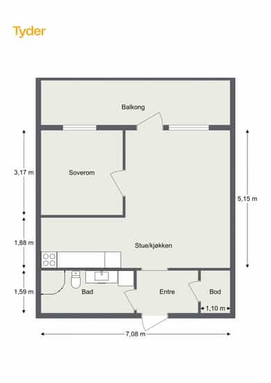 Leiligheten inneholder: - Entré - Baderom - Innvendig bod - Stue med åpen løsning mot kjøkken - Soverom - Balkong Leiligheten disponerer også en ekstern bod. Det gjøres særskilt oppmerksom på at bod som er medtatt som BRA-e og i totalt BRA ligger på fellesareal, men disponeres av denne leiligheten.