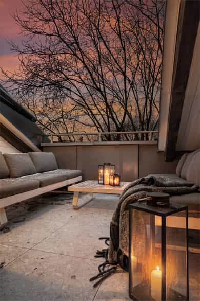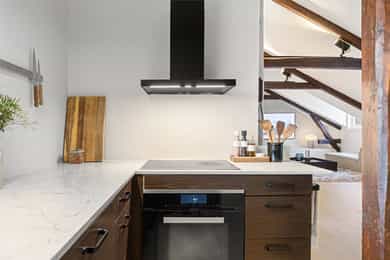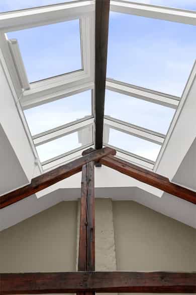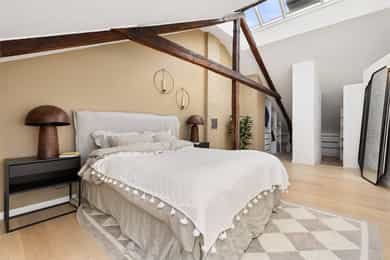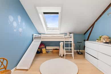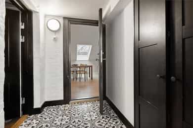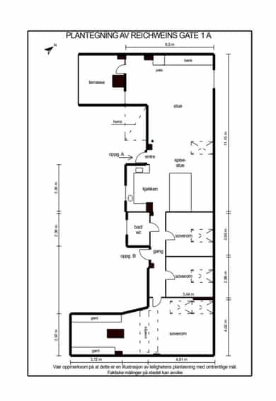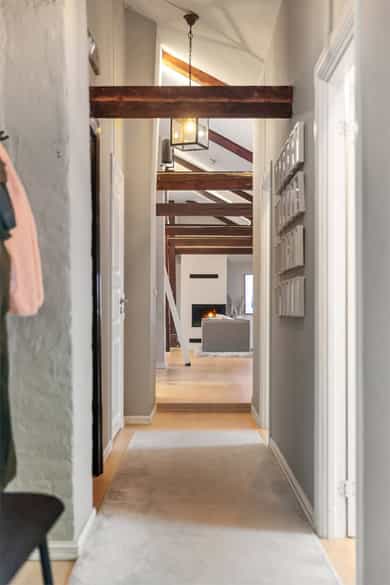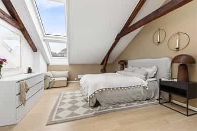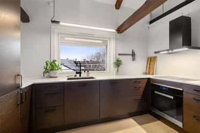 Entré, gang, kjøkken, stue-spisestue, bad/wc og 3 soverom. Hems på ca. 10 m² gulvflate. Adkomst stige fra stue. Terrasse på ca. 9,5 m² med utgang fra stue. Leiligheten disp. 1 kjellerbod på ca. 8 m². Det gjøres særskilt oppmerksom på at bod som er medtatt som BRA-e og i totalt BRA ligger på fellesareal, men disponeres av denne leiligheten. Kjøkken: Velutstyrt HTH kjøkken fra 2014 med svarte fronter. Caesarstone White Attica benkeplate med underlimt vaskekum og nedfelt induksjon platetopp. Integrert stekeovn, oppvaskmaskin og kjøl/frys. Kjøkkenøy med kompositt benkeplate. Integrert vinskap. Waterguard under benk. Miele hvitevarer. Nye skapfronter 2020. Ny vaskekum, kjøkkenøy, vinskap og benkeplate 2020. Kjøkkenventilator med avtrekk ut. Bad: Bad med nedsenket dusjhjørne med foldedører i herdet glass. Regn og hånddusj. Benkeplate med servant. Underskuffe. Speil med LED lys over servant. Vegghengt toalett. Opplegg for vaskemaskin/tørketrommel. Bad med nytt dusjgarnityr, dusjdører og baderomsinnredning, tapwell blandebatteri fra 2022. Flislagt gulv med varmekabler. Senket og malt platehimling med LED belysning. Flislagte vegger i dusjhjørne, øvrige malte flater. Naturlig ventilasjon. Tilluft fra spalte i dør og vindusventil. Fuktmåler av typen Protimeter MMS 3, utstyrt med piggelektrode, ble brukt på treverket, og det ble ikke registrert fuktighetsnivåer over det som er normalt. Garderober: Tilpasset garderobe fra Garderobeeksperten AS i hovedsoverom fra 2022. Godt med skapplass. Plassbygd sittebenk i stue fra 2022. Lagerhems med adkomst stige i stue. Gulv belagt med parkett. Glassrekkverk. Parkett og rekkverk fra 2022. Pipe og ildsted: Hjørnepeis med innsats og glass i stue. Peis fra 2022. Teglstenspiper. Flere pipeløp i leiligheten. Div. pipeløp i gården rehabilitert 2012/2013. Overflater: Gulvflater består av: 1 stavs eikeparkett. Gulv slipt og lakkert 2025. Veggflater: Malte flater, malt mur. Himlinger består av: Malte plater. Skråhimling. Synlige tak/bærebjelker. Ny himling (hevet) i mellomgang. 2022. Takhøyde stue: 3.6m på det høyeste Takhøyde hovedsoverom: 4.0m på det høyeste Balkong: Dels overbygget takterrasse med adkomst fra stuen. Gulv belagt med fliser. Sluk. Stikk og belysning. Flis (flis på flis) fra 2022. Dører: Leiligheten har 2 stk. malte profilerte ytterdør i tre. Brannklassifiserte dører iht. eier. Det er ikke synlig brannklassifisering på dørene. Malt terrassedør i tre med 3 lags isolerglassfelt fra 2024. Vinduer: Leiligheten har malte trevinduer med 3 lags isolerglass fra 2024. Leiligheten har Velux takvindu med 2 lags isolerglass fra 2024. Leiligheten har overlys i hovedsoverom fra 2024. Et overvindu elektriske styrt. Elektrisk anlegg: Automatsikringer. Sikringskap plassert i felles gang.