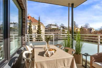 Velkommen til Nedre Skøyen vei 14 - Nyoppusset, lys og meget attraktiv leilighet i 5. etasje med garasjeplass, heis og stor, solrik balkong, høyt og fritt og uten innsyn. Leiligheten ligger i et meget ettertraktet og populært område på Skøyen. Her får du en svært god planløsning med stue og kjøkken i åpen løsning, som gir en luftig og sosial atmosfære. Lys fra 3 kanter og tilbaketrukket fra veien! Romslig soverom og stor entrè med gode garderobeløsninger Parkeringsplass i felles lukket garasjeanlegg med el-lader Endeleilighet med flott plassering og naturlig lys Flislagt bad med varme i gulv og opplegg for vaskemaskin Solrik overbygget balkong på 10 kvm med flott utsyn Lekkert kjøkken fra 2026 med integrerte hvitevarer Nymalte flater og gulv fra 2026 Ettertraktet område i vekst