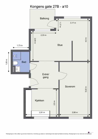 BRA-i: 53 kvm. Entré/gang, kjøkken, stue, soverom og bad.