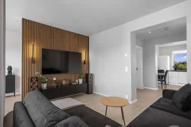 Strøken og nyoppusset 2-roms leilighet med fin planløsning. Leiligheten fremstår moderne og innbydende, med gulvvarme i alle rom, slette overflater samt listefrie overganger i både himling og rundt vinduer. Den sentrale beliggenheten i Moss sentrum gir enkel tilgang til alle byens fasiliteter, samtidig som leiligheten har enkel adkomst via trapp opp til byggets tredje etasje. Videre innenfor døren møtes man av en romslig entré med knagger for oppheng av yttertøy. Stuen har lyse overflater, downlights i himling og en elegant spilevegg gir rommet en fin kontrast. Fra stuen er det utgang til vestvendt overbygget balkong 4 kvm vendt ut mot borettslagets bakgård. Balkongen har nye terrassebord på gulvet. I stuen er det satt opp en lettvegg som deler rommet inn i flere funksjonelle soner. Denne løsningen gir en naturlig oppdeling, hvor dagens innredning består av en hyggelig sofakrok på den ene siden og en praktisk hjemmekontorplass med skrivepult på den andre. Kjøkkenet har innredning med hvite, slette fronter som gir et tidløst uttrykk, kombinert med en mørk laminat benkeplate og servantkum i kompositt. Over kjøkkenbenken er veggen beskyttet med laminatplate for enkel rengjøring. Kjøkkenet er utstyrt med integrerte hvitevarer som oppvaskmaskin, platetopp og stekeovn, samt røropplegg for vaskemaskin. Over koketoppen er det montert kjøkkenventilator med avtrekk ut. Baderommet ble som resten av leiligheten renovert i 2025 og fremstår stilrent og moderne. Rommet har helflisede overflater i en mørk gråtone, kombinert med slettmalt himling og downlights som gir et behagelig lys. Dusjnisjen har regnfallsdusj, glassdører og gulv med mosaikkflis. Innredningen består av veggmontert klosett, servantskap, speil med integrert belysning samt elektrisk håndkletørker. Leiligheten har ett soverom, innredet i en mørk og behagelig brunfarge på både vegger og tak. En dekorativ spilevegg kombinert med et stort vindu gir rommet både særpreg og rikelig med naturlig lys. Videre er rommet innredet med opphengte nattbord, spotskinne i taket og en praktisk garderobeløsning langs den ene veggen. På hver side av sengen er det integrerte lysdimmere samt uttak for USB og USB-C. Innvendige overflater: - Vegger med slettmalte overflater. - Gulv med laminatgulv. - Slettmalte overflater i himling. Tekniske installasjoner: - Vannledninger i boligen utført i plast i rør-i-rør system. Fordelerskap med etablert overløp til rom med sluk. - Nye plast avløpsrør i leiligheten tilknyttet bygningens felles avløp. - Bygningens avløp renover ved rørfornying i regi av borettslagr. - Bolig ventilert ved tilluftventiler i yttervegger, mekanisk avtrekk kjøkken og baderom. - Boligen er elektrisk oppvarmet. - Varmefordeling med gulvvarme i hele leiligheten. - VV-bereder, 120 liter express-bereder, montert i benkeskap kjøkken. - Montert automatisk vannstoppventil. - Nytt el-anlegg 2025. - Røykvarslere montert, håndslukker tilgjengelig.
