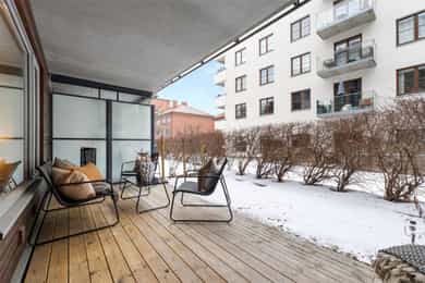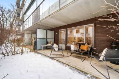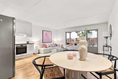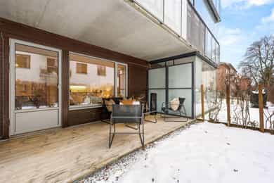 Attraktiv og stilren 3-roms m/markterrasse på 11 m² og hageflekk - Fyring og varmtvann inkl. - Heis - Felles takterrasse