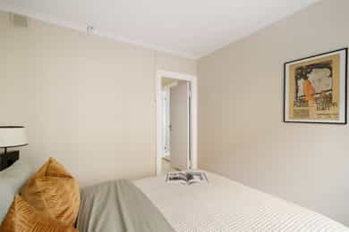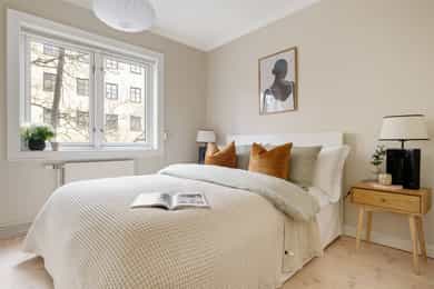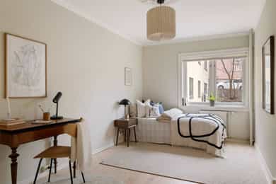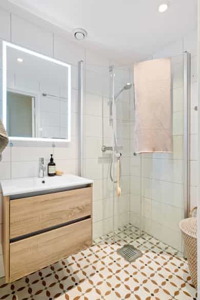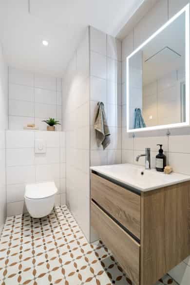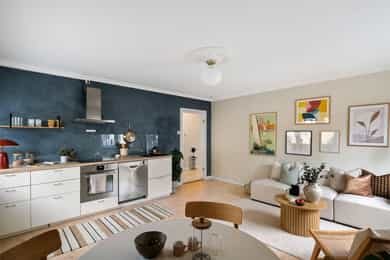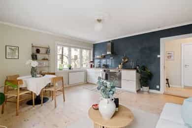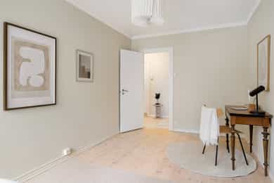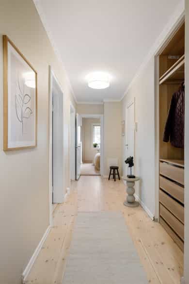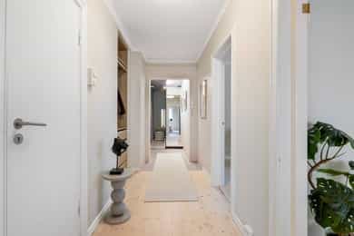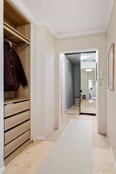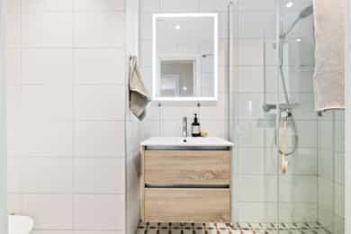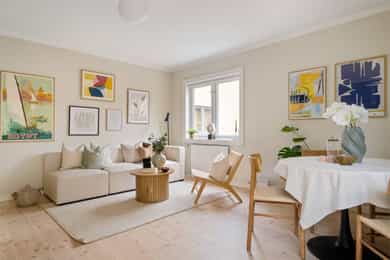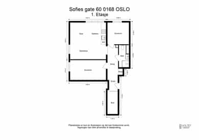 Leiligheten har en romslig planløsning som inneholder entré, bad, bod, stue med åpen kjøkkenløsning og 2 soverom. Entreen er utvidet ved å inkludere deler av tidligere fellesareal og disponibel bod (se punktet «ferdigattest»). Takhøyde i stue og kjøkken er på 251 cm. Entré Leiligheten ligger i 1. etasje med adkomst ned via trapp. En innbydende entré ønsker velkommen inn! I entréen finner du en skyvedørsgarderobe med speilfronter som skjuler en romslig bod. Videre inn i leiligheten leder en gang med klassisk stukkatur i taket. Her er det nisje med garderobeskap som gir gode oppbevaringsmuligheter. Stue Stue og kjøkken ligger i en åpen og sosial løsning, med store vindusflater som gir rikelig med lysinnslipp. Stuen har sjarmerende heltre furugulv (nyslipt i 2026), klassisk stukkatur og en dekorativ takrosett. Rommet har god plass til både sofagruppe, TV-møblement og spiseplass. Kjøkken Kjøkkenet har et stilrent og tidløst uttrykk. Innredningen består av benkeskap med glatte, hvite fronter. Benkeplaten er i heltre (nyslipt i 2026), og det er montert nedfelt platetopp og oppvaskkum. Det er hvitevarer, herunder integrert oppvaskmaskin og stekeovn. Det er montert vannstoppsystem og komfyrvakt. Det er kjøkkenventilator med kullfilter. Avsatt plass til kjøleskap. Bad Badet ble noe oppgradert i 2022 med nye, dekorative mønsterfliser på gulvet. Badet er innredet med en nedfelt servant, overhengende speil og belysning. Dusjen er plassert i hjørnet og har håndholdt dusjarmatur samt dusjvegger. Videre er det montert et vegghengt toalett og opplegg til vaskemaskin. Badet ventileres via en oppdriftsventil, samt en tilluftspalte under dørbladet. Soverom Leiligheten har to gode soverom med god plass til dobbeltseng og tilhørende møblement.