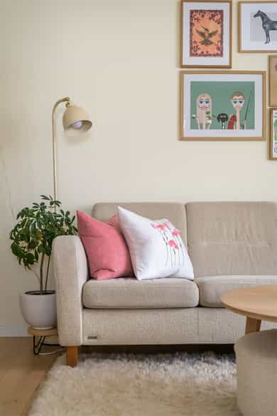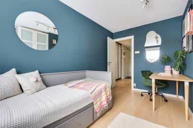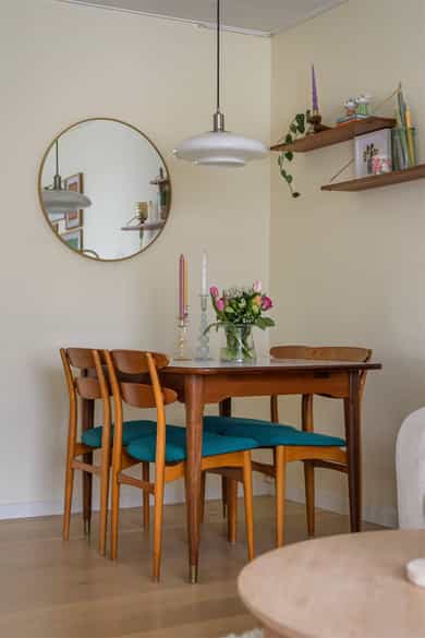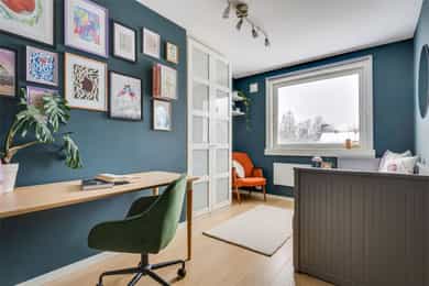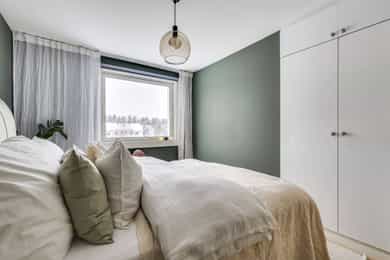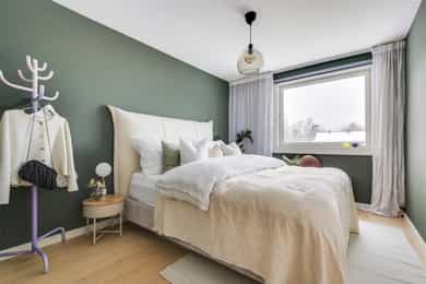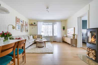 Entré Velkommen inn! Lys og åpen entré med fliser og varmekabler i gulvet og plass for oppbevaring av yttertøy og sko. Med dør-calling slipper du gjestene enkelt inn fra bakkeplan. Stue Stuen er lys og luftig med stort vindu og utgang til sydvendt balkong. I stuen er det plass til både sofagruppe og spisebord. Veggene er malt i tidsriktige farger, komplementert av nyere parkett på gulvet. Den moderne vedovnen sørger for effektiv varme og lun stemning de kjølige dagene. Balkong: Romslig balkong på ca. 6 kvm vendt mot syd, med herlig utsyn mot grønne omgivelser. Balkongen vender mot parken og har fantastiske solforhold fra morgen til kveld. Her kan du nyte late sommerdager uten sjenerende innsyn eller veitrafikk. Kjøkken Separat kjøkken med praktisk demonterbar barløsning under vinduet. Ikea-innredning fra 2013 med hvite glatte fronter og benkeplater av oljet eik. Håndtak ble skiftet og benken slipt og oljet i 2023. Kjøkkenet er utstyrt med integrerte hvitevarer som stekeovn og mikro i ståhøyde, induksjonstopp, oppvaskmaskin og kjøle-/fryseskap. Klassiske subway-fliser på veggen over benkene beskytter mot søl og smuss og gir et gjennomført uttrykk. Ventilatoren har kullfilter og det er montert Waterguard under vasken. Bad Rålekkert flislagt bad med varmekabler i gulvet. Badet ble totalrenovert i 2023 i forbindelse med rørfornying i regi av borettslaget. Det ble gjort tilvalg på fliser og innredninger. Badet er utstyrt med speil med dimbart lys, innredning med oppbevaring, og servantbolle over benkeplate. Videre er det dusjsone med regn- og hånddusj, vegghengt toalett og opplegg for vaskemaskin. Soverom Leiligheten har to gode soverom. Det største soverommet har plass til dobbeltseng og skrivebord i tillegg til medfølgende garderobeskap. Det andre soverommet egner seg godt som gjeste-/barnerom eller kontor. Her er det også plass til skrivebord og seng, i tillegg til medfølgende garderobeskap.