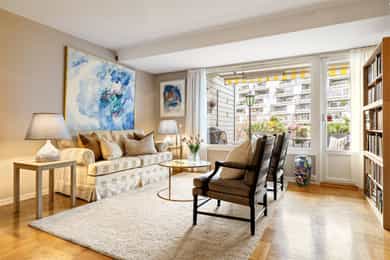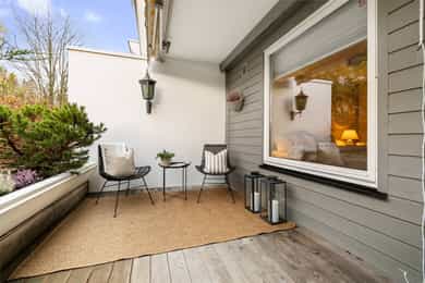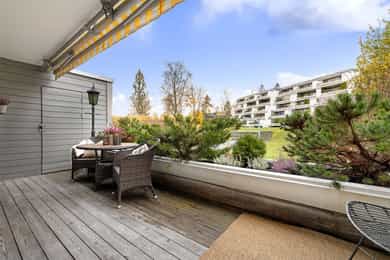 Lys, tilbaketrukket terrasseleilighet med sørvestvendt uteplass og garasjeplass. Solrikt og fredelig i et veldrevet sameie med store, grønne fellesområder. Boligen har god og åpen planløsning, og er blant annet oppgradert med bad, vinduer og terrassedør i nyere tid. Kort vei til butikk, buss, T-bane, servicetilbud og flotte turmuligheter.