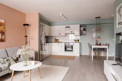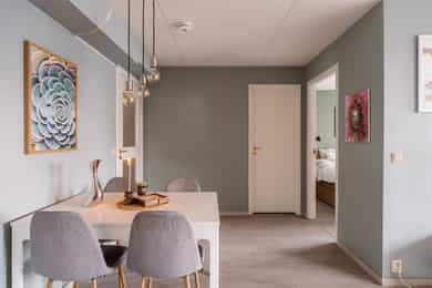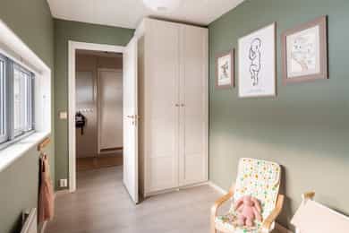 Ditt nye hjem - Rom for rom Entré Velkommen inn! Her kommer man inn i en lys og romslig entré med god plass til oppbevaring av yttertøy og sko. Her er det plass til både kommode og knagger, og gangen gir et ryddig førsteinntrykk med enkel adkomst videre til boligens øvrige rom. Stue Leiligheten er betydelig oppgradert de senere årene. I 2021 ble det lagt nytt gulv i hele boligen, og samtlige vegger ble malt i tidsriktige fargetoner, noe som gir et helhetlig og moderne uttrykk. Stue og kjøkken ligger i åpen og sosial løsning, med gode møbleringsmuligheter for både sofagruppe og spiseplass. Store vindusflater gir rikelig med naturlig lys og bidrar til en luftig romfølelse. Fra stuen er det utgang til en nord-østvendt, overbygd balkong på ca. 6 kvm. Kjøkken Kjøkkenet har en innredning med hvite profilerte fronter, bestående av både over- og underskap. Det er montert belysning under overskap over vask, og fliser mellom benkeplate og overskap. Benkeplaten er i laminat, med nedfelt oppvaskkum i rustfritt stål og ettgreps svingbart blandingsbatteri i krom. Kjøkkenet er utstyrt med integrerte hvitevarer, herunder induksjonsplatetopp og stekeovn. Avtrekksvifte og integrerte hvitevarer er nye fra 2025. Det er også installert komfyrvakt og aquastopp som stanser vanntilførselen ved eventuell lekkasje. Soverom Boligen har to lyse og trivelige soverom med god planløsning og fine møbleringsmuligheter. Hovedsoverommet har plass til dobbeltseng, nattbord og god lagringsplass i garderobeskap. Det andre soverommet egner seg godt som barnerom, gjesterom eller hjemmekontor. Rommet har en praktisk utforming med plass til seng, skap og leke- eller arbeidsplass, og er utstyrt med plisségardin montert i 2021. Begge soverommene har gjennomgående overflater som gir et helhetlig og pent uttrykk. Bad/vaskerom Badet er innredet med servantskap med nedfelt servant, veggskap med speil og belysning over. Dusjsonen har gulvmontert dusjløsning med fastmontert glassvegg og dusjforheng. Det er opplegg for vaskemaskin. Rommet har varmekabler i gulv og takplater i himling. Boder Boligen disponerer en innvendig bod som gir god oppbevaringsplass, samt en utvendig bod ved inngangspartiet på ca. 5 kvm, godt egnet for lagring av sesongutstyr, sportsutstyr og annet.