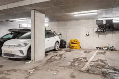 Boligen disponerer en fast garasjeplass merket nr. 132 i lukket felles garasjeanlegg, tilrettelagt med elbillader. Sameiet tilbyr gode gjesteparkeringsmuligheter, og det er i tillegg sykkelparkering i lukket felles rom.