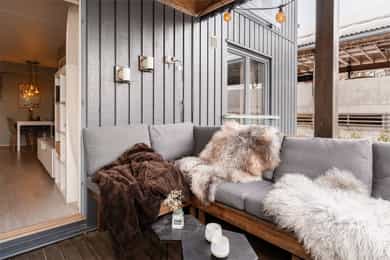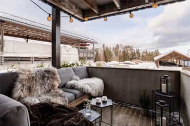 Boligen har flere attraktive uteplasser som gir gode bruks- og solforhold gjennom dagen. Fra stuen er det utgang til en nordøstvendt, overbygd balkong på ca. 6 kvm. Balkongen har rekkverk med tette plater på innsiden og panel utvendig, samt installert dobbel stikkontakt, et fint sted for morgenkaffe eller rolige stunder utendørs.
