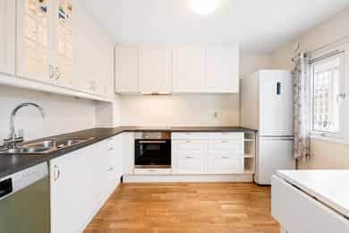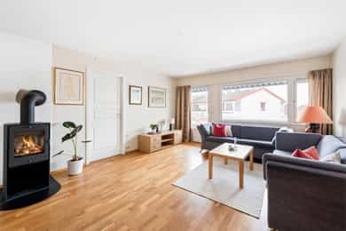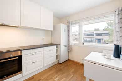 Det er i forbindelse med salget utarbeidet en tilstandsrapport fra bygningssakkyndig. Tilstandsrapporten er en teknisk gjennomgang av boligen med oppdagede avvik. Forhold som har fått TG2 og TG3 må gjennomgås spesielt nøye, da disse indikerer avvik fra normal slitasje og/eller høy alder, med mulig behov for utbedring. Bygningsdeler som har fått TGIU er ikke undersøkt av takstmann. Stue Stor stue med store vindusflater som gjør rommet lyst og luftig. Utgang fra stuen til den solrike verandaen. Veranda/ Terrasse / Balkong Solrik og vestvendt veranda med utgang fra stue. Verandaen er på 8 kvm. Utebod på 2,6 kvm, markise. Kjøkken Flott adskilt kjøkken med morgenlys. God skap- og benkeplass. Kjøkken med lyse fronter. Integrerte hvitevarer med ovn, platetopp, oppvaskmaskin og kjøl/frys. Mekanisk ventilator over platetopp. Kjøkkenet er fra 2010 av tidligere eier, har et klassisk og pent design med gode benkeflater og mye oppbevaringsplass. Innredningen har laminatbenkeplate fra 2020 med nedfelt kum i stål. Soverom Soverom 1 med skapplass. Inngang fra soverom til baderom. Soverom 2. Baderom Pent bad med varme i gulv. Badet har også har baderomsplater på vegger og slett himling, samt dusjkabinett, servant og toalett. Opplegg for vaskemaskin som følger med boligen. Badet ble overflateoppusset i 2020 av tidligere eier, og fremstår som tidsmessig og pent. Entré Entre med oppheng for ytterjakker. Dør mellom entre og stue. Innbo og løsøre Vedlagt salgsoppgaven følger NEF sin standardliste "Oversikt over løsøre og tilbehør". Med mindre annet fremkommer av salgsoppgaven gjelder denne listen. Dersom det er noe i overnevnte liste som ikke finnes på eiendommen, vil det heller ikke medfølge. Produkter og installasjoner som medfølger overdras uten noen form for garantier, utover eventuell gjenværende leverandørgaranti. Hull og merker etter feste av innredning og utstyr som ikke følger med, aksepteres av kjøper. Vaskemaskin følger med boligen. Skap på baderom følger boligen.