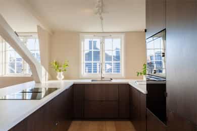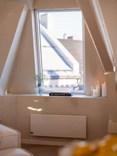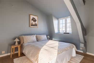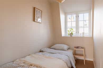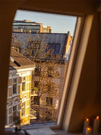 GANG Yttergang med god plass til sko i skap og jakker i nisje. Det er lagt nye, pene fliser på gulv. Porttelefon montert på vegg. Dør direkte ut til takterrasse og inn til leilighet. STUE Leiligheten har en lys og stor hjørnestue med god plass til stort spisebord og sofagruppe. Mange, store vindusflater i forskjellige retninger gir gode lys- og utsiktsforhold. Her kan man nyte fantastiske himler ved solnedgang og soloppgang! God plass til stort spisebord, samt hyggelig TV-stue i motsatt ende av stuen. Enstavsparkett på gulv, og nymalte overflater i 2024. Vendbar peisovn med glassdør og sideglass slik at man kan se den både fra spisestue og sofagruppe. Pipeløp i gården rehabilitert 2013 med ny innvendig stålpipe. TAKTERRASSE Utgang fra spisestuen og ut til takterrassen. Perfekt for varme sommerdager! Her har man god plass til diverse utemøbler og grill. Svært gode solforhold med sol fra ca. 10:00 til seint på kvelden om sommeren. Opplysning gitt av selger. Takterrassen vender mot rolig, indre gårdsrom. KJØKKEN Nyoppusset og rålekkert kjøkken med laminerte benkeplater, slette skapfronter og malt backsplash. Integrerte hvitevarer og oppvaskmaskin som medfølger. Påkostet platetopp med integrert ventilator (kullfilter). Waterguard og komfyrvakt er montert. HOVEDSOVEROM Hovedsoverom med direkte adkomst til dusjrom/bad. God plass til dobbeltseng, nattbord og skap. Stort vindu som slipper inn godt med naturlig lys. Det er plass til å sette inn skap og kommode hvis det er ønskelig. Vegger nymalt i 2025. BAD Praktisk dusjrom/bad med adkomst direkte fra hovedsoverom. Badet er utstyrt med dusj og servant. Senket og malt platehimling med downlights. Flislagte vegger og gulv med varmekabler. Downlights i tak. SOVEROM II Dette rommet er i dag innredet som soverom men passer også godt som walk-in-closet, gjesterom og/eller kontor. Koselig vindu med dyp vinduskarm også i dette rommet. Begge soverommene vender mot rolig gate. Nymalte vegger i 2025. HEMS Trapp opp fra spisestuen til en romslig hems på ca. 9 kvm. Hemsen har flere bruksmuligheter som for eksempel gjesteseng, TV-stue eller som bod. Madrassen som er på bildene er 180 cm. Praktisk med en liten bod på hemsen. Perfekt til oppbevaring av for eksempel kofferter, vintertøy og verktøy. Her er varmtvannsberederen på 192 l plassert. Berederen er plassert i et "basseng" på hems. SEPARAT WC Wc med vegghengt toalett og servant. Benkeplate. Opplegg for vaskemaskin. Flislagt gulv med sluk og varmekabler. Toalett montert 2018.