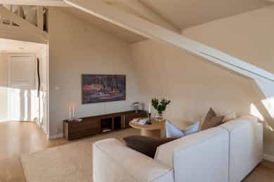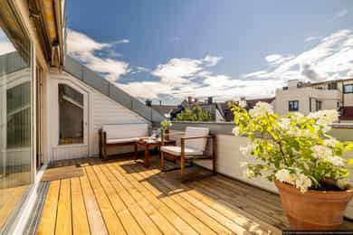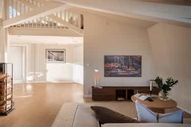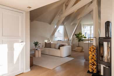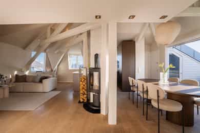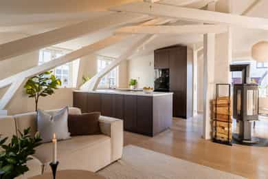 Unik topp- og hjørneleilighet på 81 kvm (gulvflate) med svært solrik takterrasse på 13 kvm, peis og hems. Bør sees!
