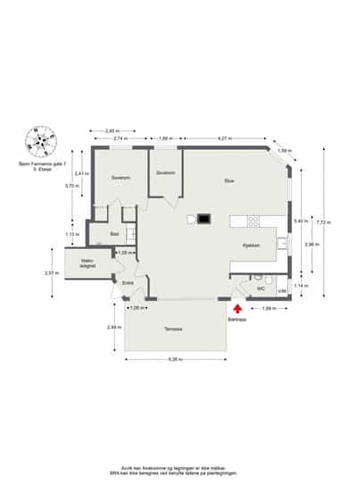 Leiligheten ligger i byggets toppetasje og har følgende planløsning: Gang, to soverom, stue med åpen kjøkkenløsning, separat toalett, bad og hems. I tillegg disponerer boligen to romslige kjellerboder på henholdsvis 4 kvm og 8.9 kvm. Det finnes også en praktisk loftsbod på hemsen. Terrassen er oppmålt til 13,1 i gulvflate. Målt opp til 12 kvm pga. noe lak takhøyde noen steder.