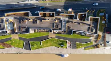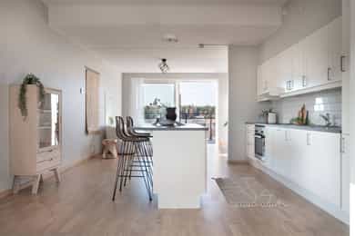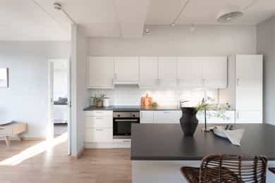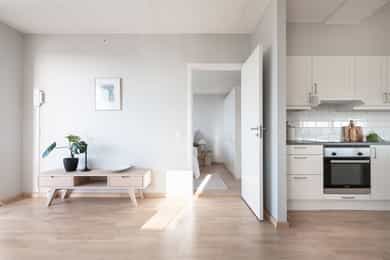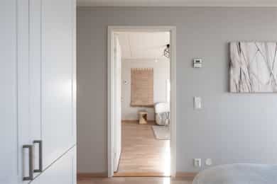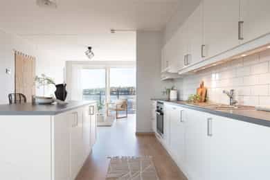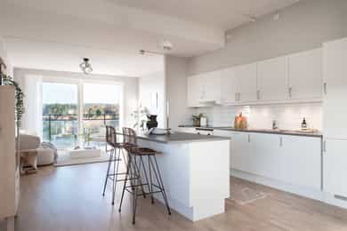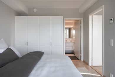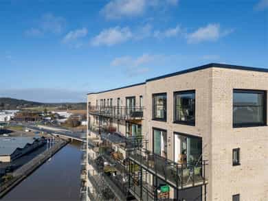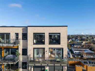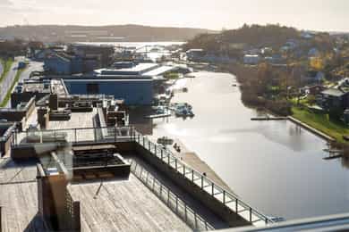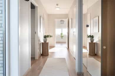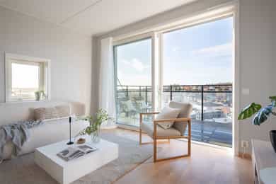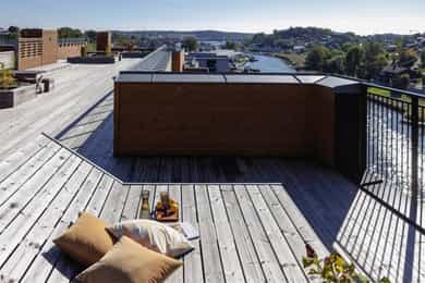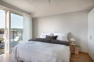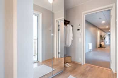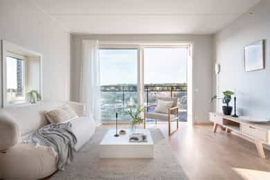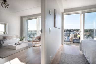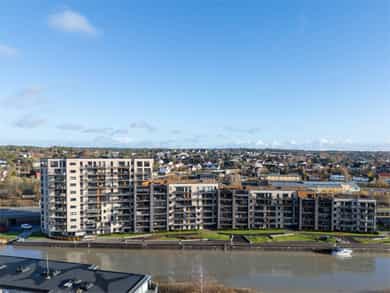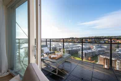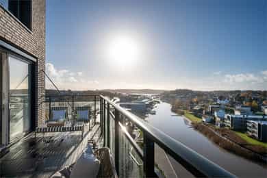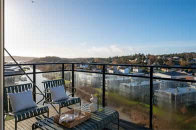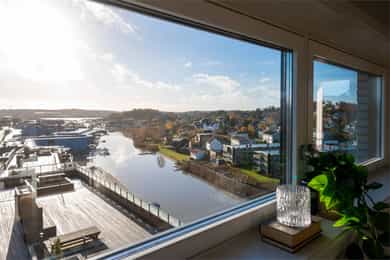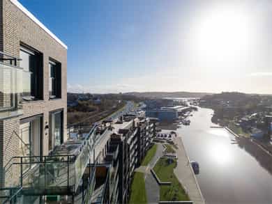 Det første du møter ved Fredrikstads vestre innfart er Mosseveien 71 — en slank og moderne murblokk ved elvebredden. Den attraktive beliggenheten byr på bryggepromenade, mulighet for båtplass og rask tilgang til sentrum langs flotte sykkelveier, med busstopp rett utenfor døren. Fellesområdene rundt blokken fremstår som et forseggjort parkanlegg. I tillegg til en av byens flotteste takterrasser, kan beboere låne både et festlokale og sykler. Den gjennomgående leiligheten fra 2021 ligger ytterst i 10. etasje med store vinduer og en deilig, romslig, vestvendt balkong som gir fenomenal utsikt mot sør, nord og vest — mot solnedgangen, og du får en unik oversikt. Boligens sjenerøse takhøyde åpner opp de stilrene rommene. To soverom, to bad, vannbåren varme og balansert ventilasjon.