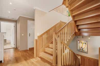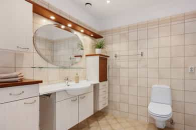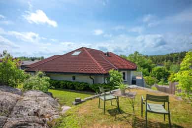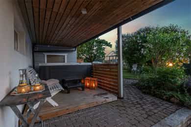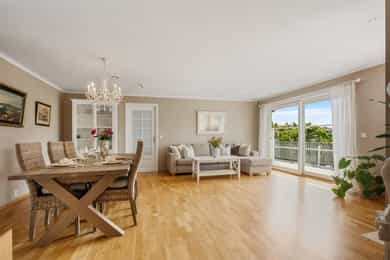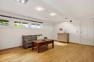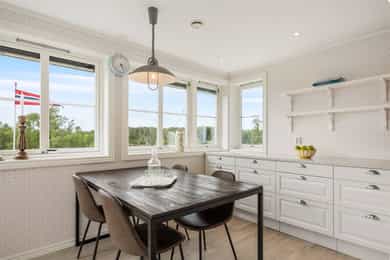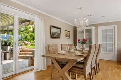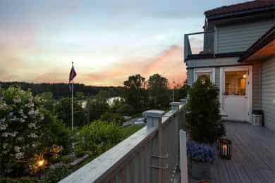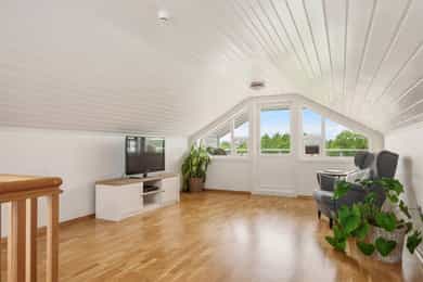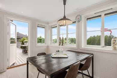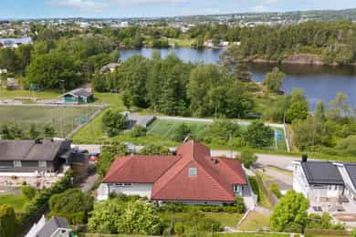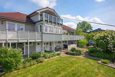 Eiendommen har enkel adkomst der pent opparbeidede og innbydende uteområder ønsker velkommen. Blindvei gir lite gjennomgangstrafikk og parkering gjøres enkelt i dobbelgarasje eller på egen steinbelagt gårdsplass. Boligen er velholdt med generell 2000-standard og har fått utført en rekke oppgraderinger de siste årene. En innholdsrik og familievennlig planløsning strekker seg over tre plan og veranda på alle boligens sider gjør det enkelt å flytte seg etter solen gjennom dagen. Veranda, overbygd takterrasse, uteplasser på bakkeplan og hagearealet gir ulike soner for utemåltider, avslapning og aktivitet - her kan fine dager nytes til det fulle! • Underetasje: Inngangspartiet er overbygd med to separate ytterdører og vindfang inn til underetasjen. "Hoveddelens" vindfang og hall har to skyvedørsgarderober med speilfronter og fliser eller gyllen eikeparkett på gulv. Videre er det adkomst til to kjærkomne stuer for familien - ekstra oppholdsrom til lek, vennebesøk og avslapning, hvorav den innerste stuen har gulvfliser, barløsning og plass til spise- eller avslapningsmøblement. Herfra er det også utgang til den frodige hagen for en sømløs overgang mellom ute og inne - perfekt når man underholder gjester eller nyter hjemmedager med familien. Vindfang til den nordre fløyen, der mulighet for hybelleilighet eller en fin gjeste-/ungdomsavdeling ligger, har flislagt gulv og hylle med knagger. Herfra fører en gang videre til et stort bad og romslig stue med soveromnisje, samt til hall i hoveddel. I stuen er det klargjort til kjøkkenløsning med røropplegg i vegg. Fra stuen tar en stor skyvedør deg ut til adkomstterrassen. Badet fra 2000 er romslig med flislagte overflater i gråtoner og behagelig gulvvarme. Innredningen består av dusjkabinett, toalett, servantskap og høyskap i samme stil for oppbevaring. En flott eiketrapp binder de tre etasjene sammen og fører fra hall i underetasje opp til 1. etasje. • 1. etasje: Hovedstuen er et pent og romslig oppholdsrom, med åpen atmosfære og godt gjennomlys via store vindusflater på flere sider av rommet. Dagslyset i stuen suppleres fint av downlights og taklampe. Lune kvelder sikres av en elegant peis med dekorativ hvit ramme rundt, og eikeparkett på gulv kombineres med overflater holdt i duse fargetoner. Rommet har plass til spisestue, sofagruppe og annet ønsket møblement. Ved dagens spisestue fører dobbel glassdør til sydøstvendt uteplass med overbygg som gir le for vær og ikke minst naturlig solskjerming på varme dager, samt steintrapp som fører videre opp til grønn hage. Fra dagens sofahjørne fører en stor skyvedør ut til vestsiden av veranda, som gir en fin forlengelse av stuen på sommerdager. Et flott kjøkken er hjertet i huset; ombygd og oppusset i 2017. Stilen er klassisk og samtidig tidløs, med 1-stavs laminatgulv og småmønstret tapet på veggene. Rommets gode atmosfære må nesten oppleves selv med den romslige størrelsen, en hel vegg med vinduer, rikelig med innredning og muligheten til å trekke ut med måltider via verandadør. Innredningen har hvite, profilerte fronter, vitrineskap og lys benkeplate i polert kompositt med nedfelt komposittkum. Det er god benk- og oppbevaringsplass så her kan både store og små bli med på matlagingen. Over benk er det metrofliser og i tillegg til naturlig lys fra de mange vindusflatene er det downlights i tak. Hvitevarene er integrerte og består av oppvaskmaskin, integrert platetopp i kjøkkenhalvøy med takhengt ventilator, stekeovn og kombiovn med mikro/stekeovn. Innerst i rommet er det plass til hyggelig sone for spisebord med utsikt mot Vansjø. Boligen har totalt tre bad fra 2000 der to av badene er plassert i 1. etasje. Det minste av badene ligger i trapperom og ett bad er en suite bad til hovedsoverom - en behagelig hverdagsluksus! Badet har flislagte overflater, gulvvarme og downlights. Innredningen består av en stor skap- og skuffeinnredning med sjalusidør, nedfelt servant, rundt speil og innfelt lys, toalett og badekar med dusjløsning. Det minste badet har samme fliser som en suite badet og er innredet med toalett, servantskap, overskap med speil og innfelt lys, og dusjhjørne. For klesvask er det eget vaskerom fra 2000, innredet med en rekke skap, inkludert et hendig benkeskap med nedfelt utslagsvask. Under en høy arbeidsbenk er det opplegg for vaskemaskin og tørketrommel. Fra vaskerommet er det utgang til veranda mot nordøst - perfekt for tørking av klær på sommerstid. Boligen har totalt fire gode soverom, hhv. ett i underetasje som beskrevet og tre rom i 1. etasje. Hovedsoverommet ligger i suiteløsning med bad og har direkte utgang til vestvendt del av veranda for rolige morgenstunder med fuglekvitter og kaffekoppen i hånda. Rommet har en smart garderobeløsning med skap etablert over og på begge sider av den avsatte plassen for dobbeltseng, i tillegg til stor skyvedørsgarderobe. Soverom 2 og 3 i etasjen fungerer ypperlig som barne- eller ungdomsrom, med møbleringsfrihet og plass til seng og garderobe. Ett av soverommene har utgang til samme vestvendte veranda som stue og kjøkken, og et eget praktisk omkledningsrom med hylleinnredning og vinduer. Hele fire soverom betyr mange valgmuligheter for familien, og ved behov kan rommene benyttes som kontor, gjesterom, walk-in garderobe eller ekstra stue. • Loftsetasje: Den øverste etasjen består av en lys og trivelig loftstue på 24 kvm med egen uteplass. Trekk deg tilbake for litt egentid med en god bok eller film, eller kanskje barna skal få innrede et spillrom. Den vestvendte takterrassen på 10 kvm har flotte sol- og utsiktsforhold, overbygg og stilrent glassrekkverk som slipper inn lyset. I motsatt ende fra terrassen har loftstuen et stort takvindu, og det er tilgang til kneloft for lagring. For ytterligere lagringsplass kan det benyttes kaldtloft, utebod, bod ved hallen og i teknisk rom i underetasje. Innvendige overflater: - Vegger med malt strie, tapet og fliser. - Gulv